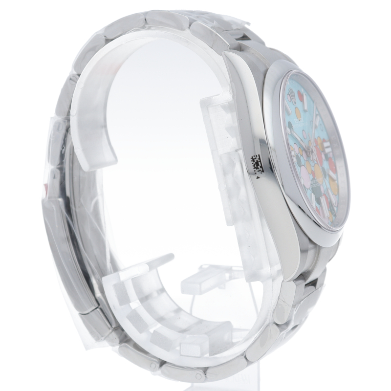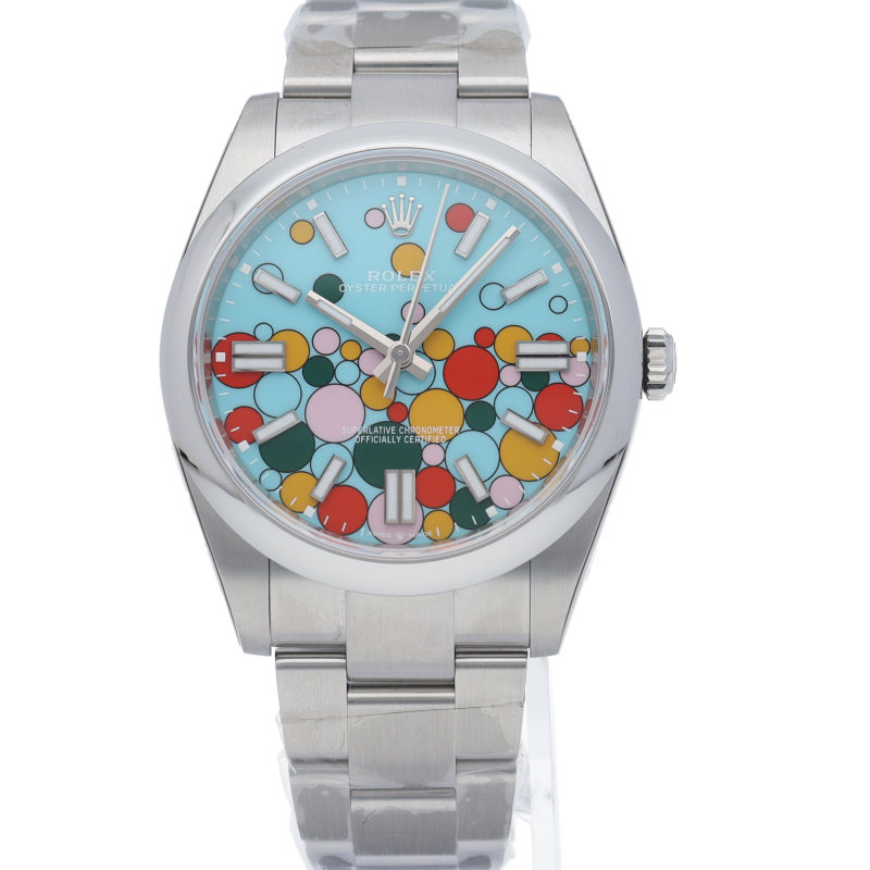 2020年に発表されたオイスターパーペチュアルのラッカーダイヤルカラー(キャンディピンク、ターコイズブルー、イエロー、コーラルレッド、グリーン)を様々なサイズにして散りばめたセレブレーションダイヤルは、今までになかった斬新なデザインで2023年新作モデルの1本です。