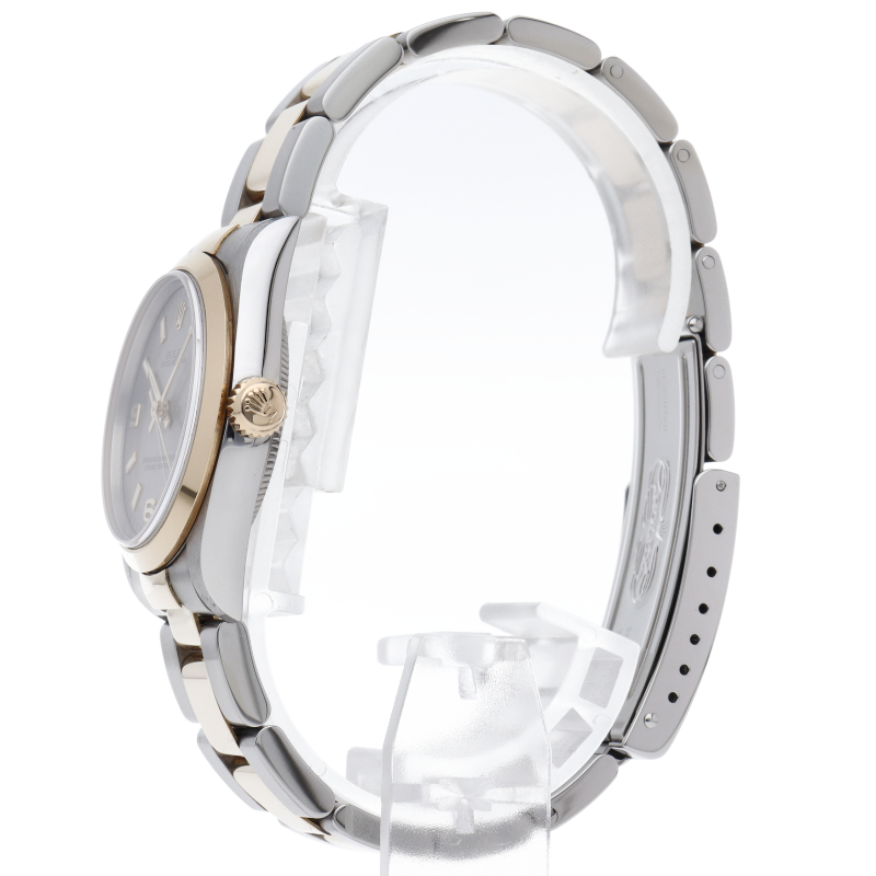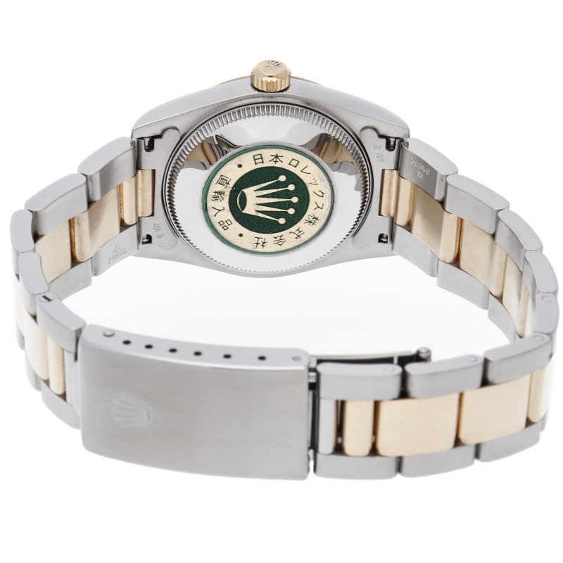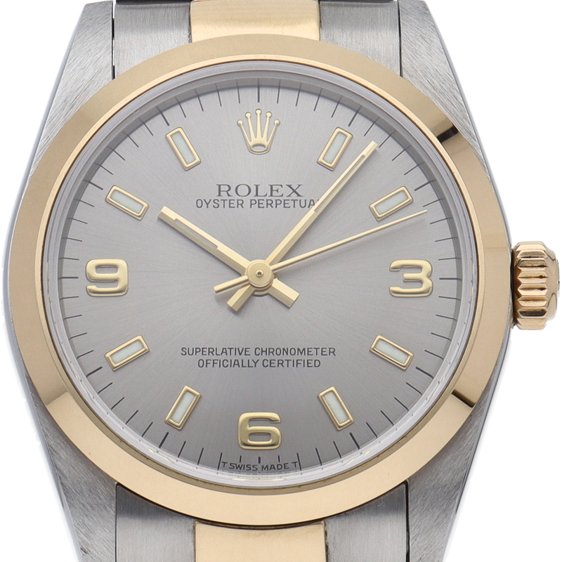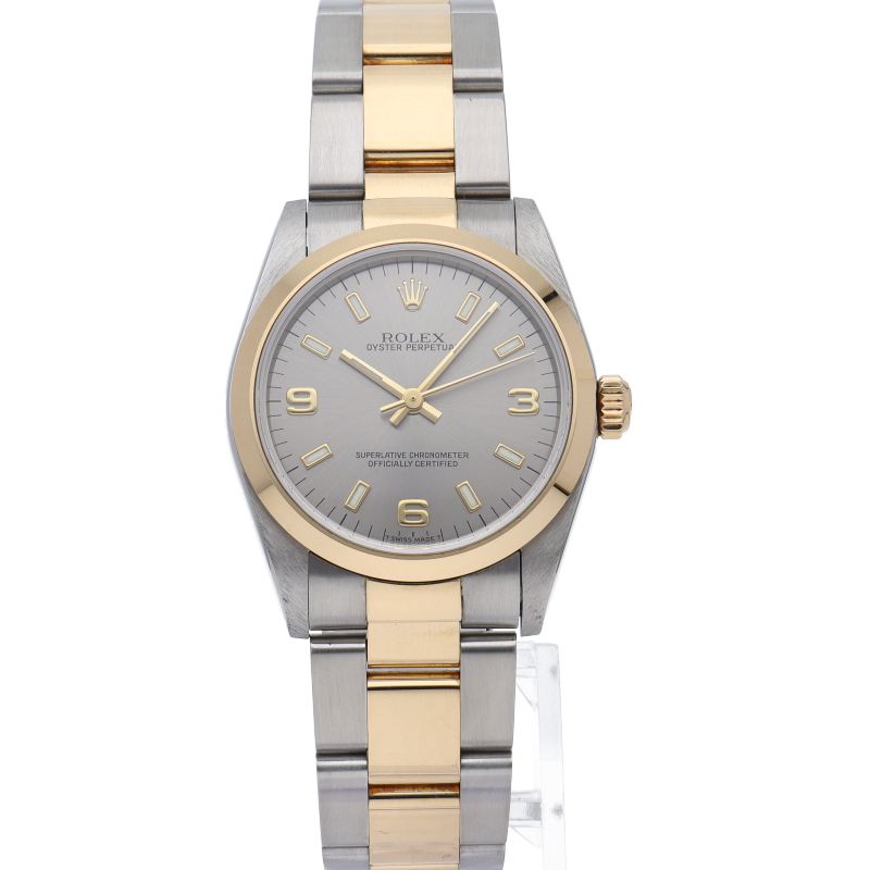 ロレックスのデイリーウォッチとして人気の「オイスターパーペチュアル」。こちらはイエローゴールドとのコンビ仕様で高級感も兼ね備えた1本。