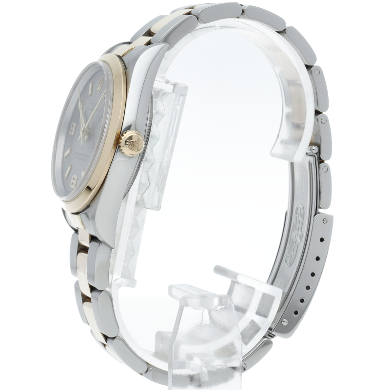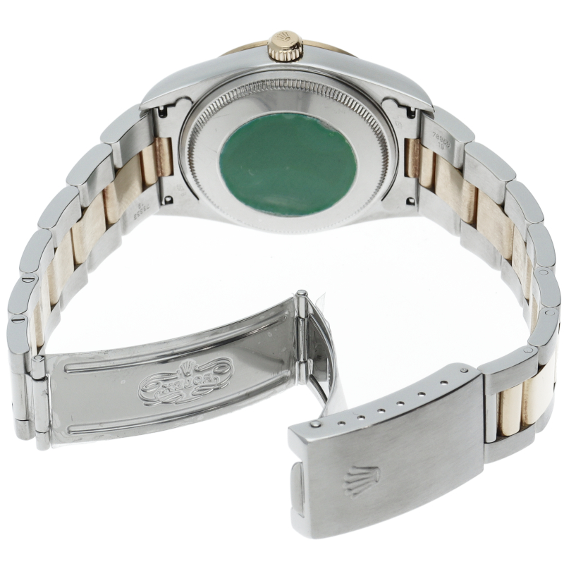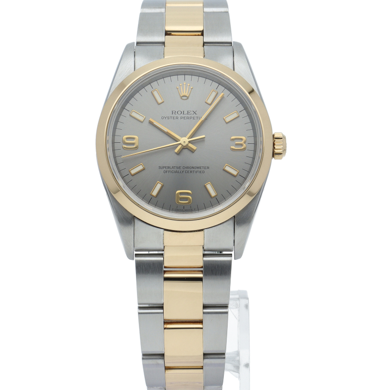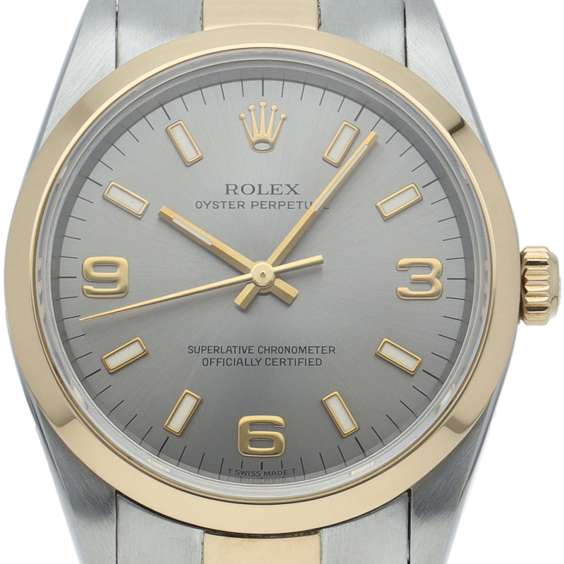 ロレックスのデイリーウォッチとして人気の「オイスターパーペチュアル」。こちらはイエローゴールドとのコンビ仕様で高級感も兼ね備えた1本。