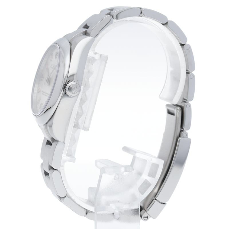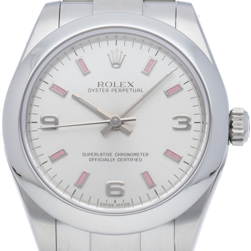 ケースサイズ31mmのユニセックスモデルのオイスターパーペチュアル。すっきりとシンプルなベゼルがブレスレットとの絶妙なバランスを実現しています。
