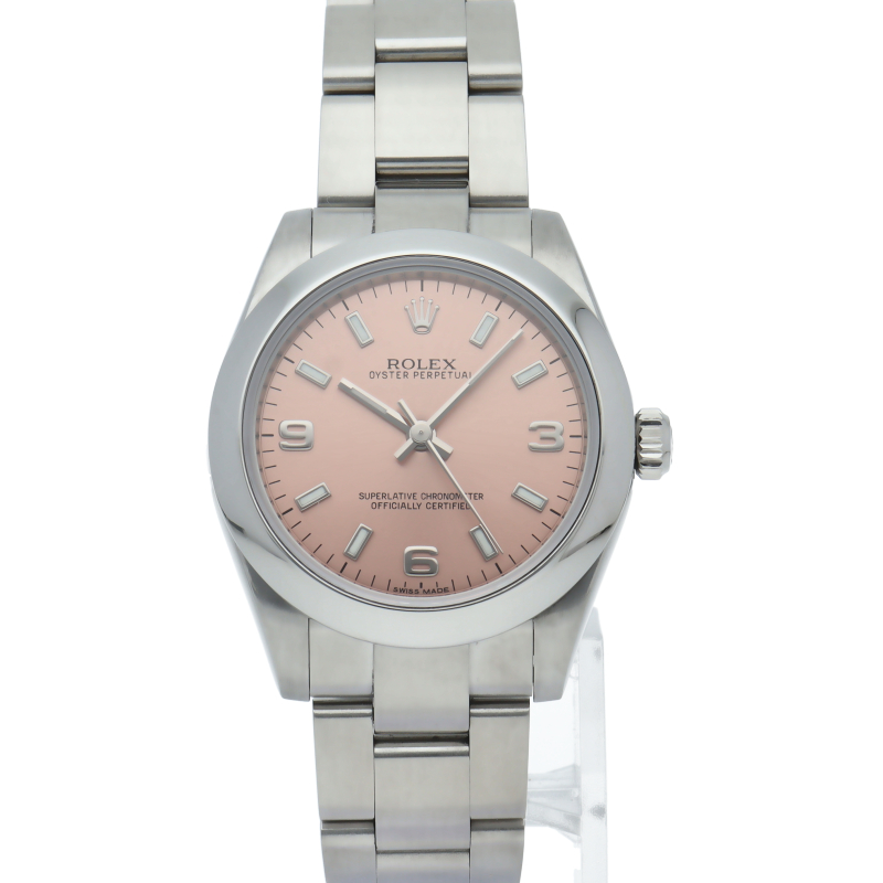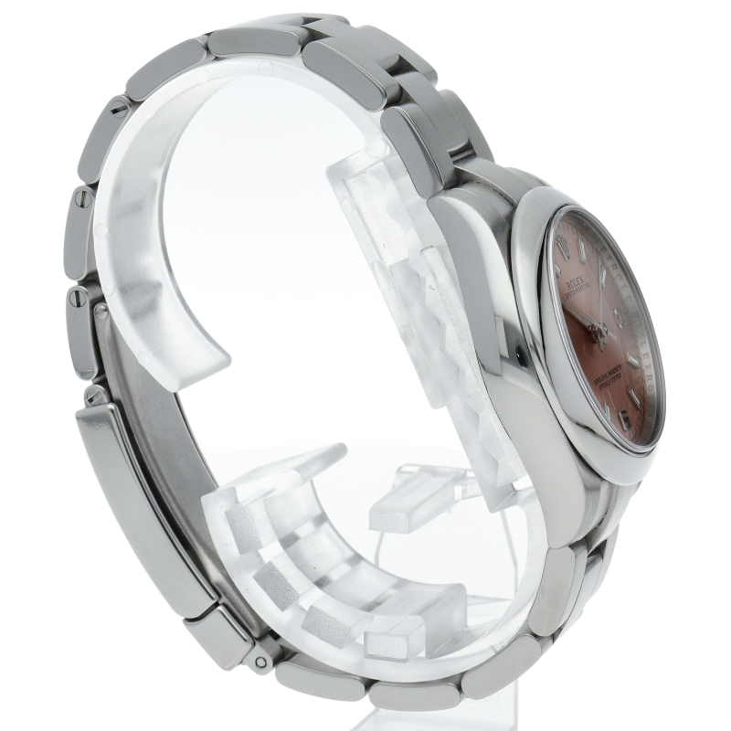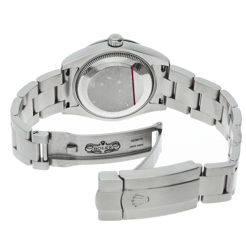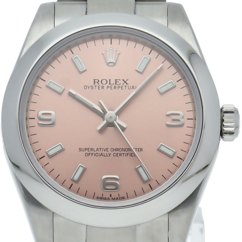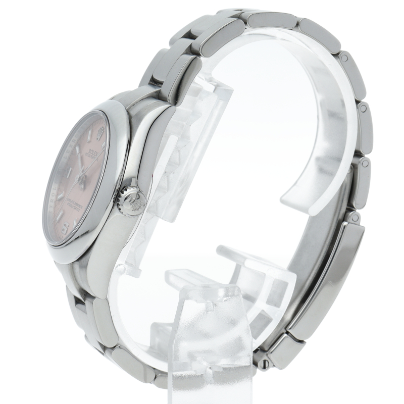 ケースサイズ31mmのユニセックスモデルのオイスターパーペチュアル。すっきりとシンプルなベゼルがブレスレットとの絶妙なバランスを実現しています。