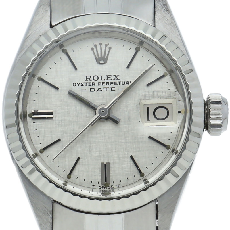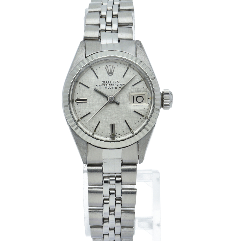 ロレックスの中でもシンプルな3針で時計本来の機能を追求した「オイスターパーペチュアル」。デイト表示機能付でビジネスからカジュアルまでスタイルを選ばないデザインが魅力です。アンティークなプラ風防と巻きブレスが逆に新鮮です。モザイク文字盤。
