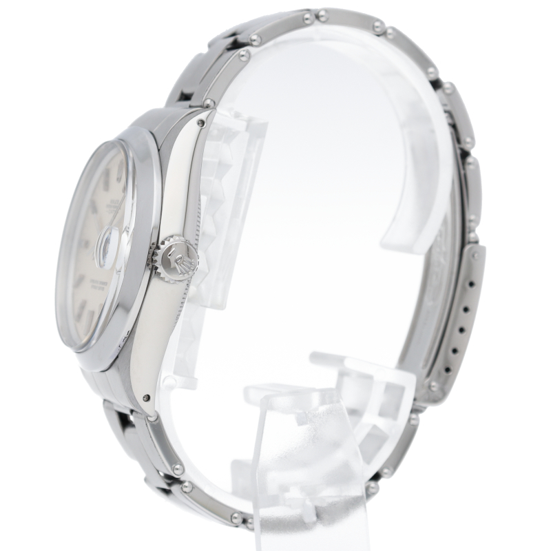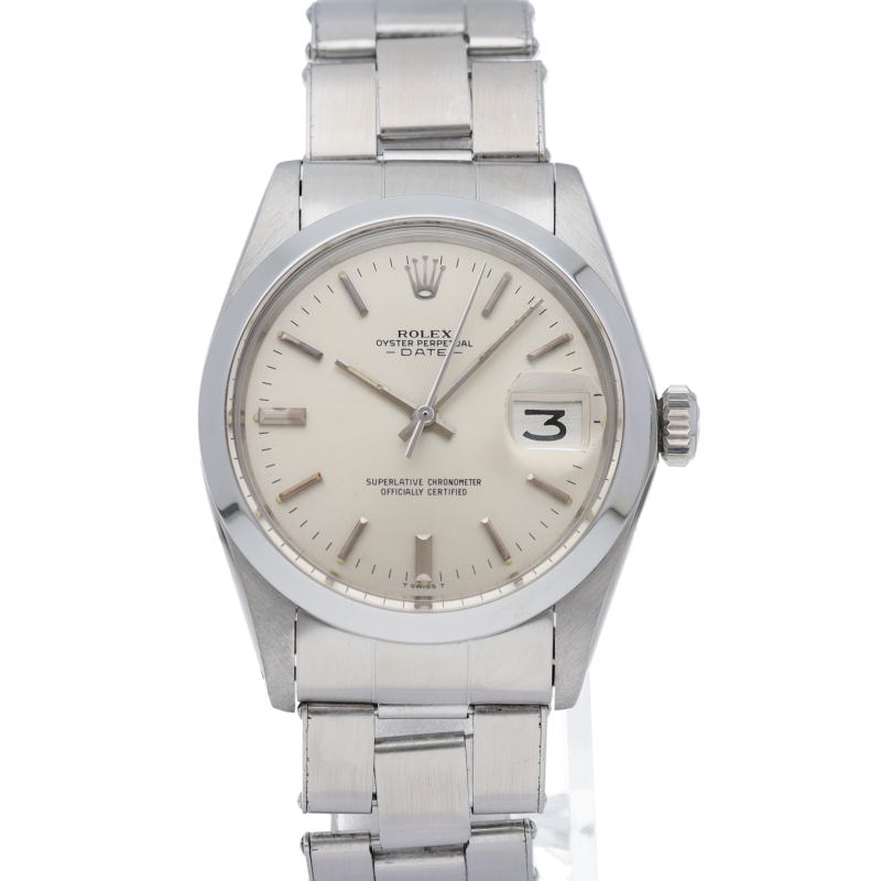ロレックスの中でもシンプルな3針で時計本来の機能を追求した「オイスターパーペチュアルデイト」。洗練されたデザインはスタイルを選ばず使用できます。クロノメーター表記の中央の空間が揃っている「センタースプリット」となっています。