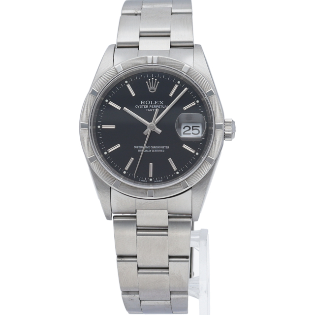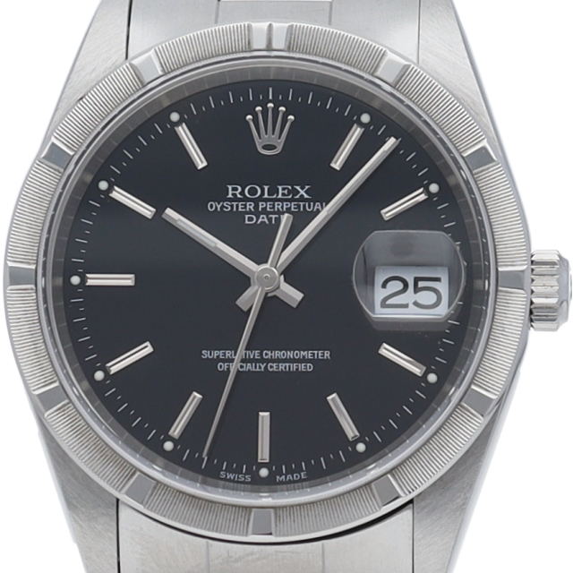 ロレックスのデイリーウォッチとして人気の「オイスターパーペチュアルデイト」。ビジネスからカジュアルまでスタイルを選ばないデザインが魅力です。エンジンターンド ベゼル。