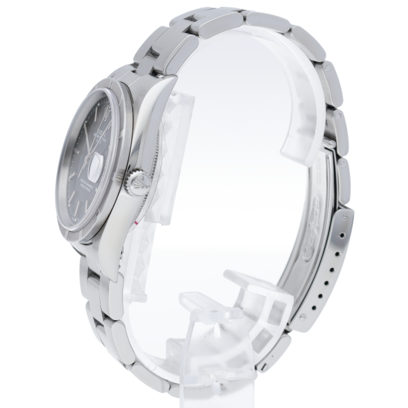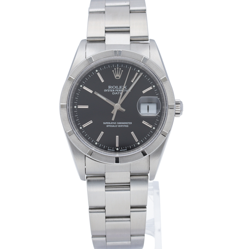 ロレックスのデイリーウォッチとして人気の「オイスターパーペチュアルデイト」。ビジネスからカジュアルまでスタイルを選ばないデザインが魅力です。エンジンターンドベゼル。