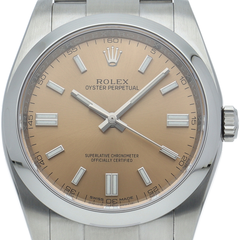 ロレックスの中でもシンプルな3針で時計本来の機能を追求した「オイスターパーペチュアル」。洗練されたデザインはスタイルを選ばず使用できます。