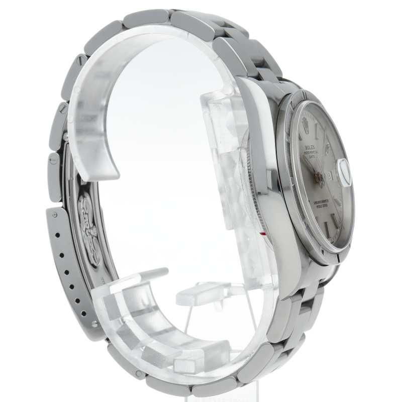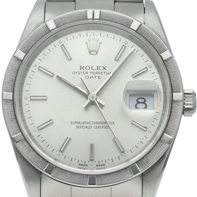 ロレックスの隠れた名作「オイスターパーペチュアルデイト」Ref.15210。最大の特徴は、航空機のエンジンを模した「エンジンターンドベゼル」です。刻まれた凹凸が渋い輝きを放ち、小傷も目立ちにくい実用的な仕様。34mmの絶妙なサイズ感と名機Cal.3135の信頼性を備え、シンプルながらも個性が光る通好みの生産終了モデルです。
