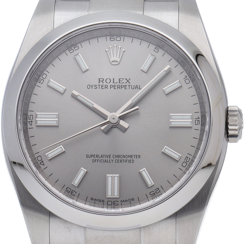 ロレックスの中でもシンプルな3針で時計本来の機能を追求した「オイスターパーペチュアル」。洗練されたデザインはスタイルを選ばず使用できます。
