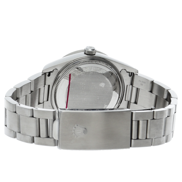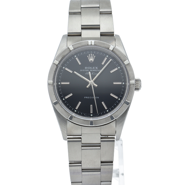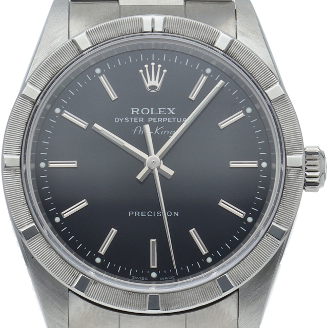 ロレックスの中でもシンプルでオーソドックなデザインが人気の「エアキング」。時計本来の性能を追求し、スタイルを選ばず使用できます。エンジンターンドベゼル仕様。