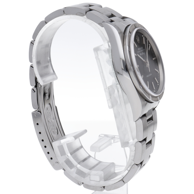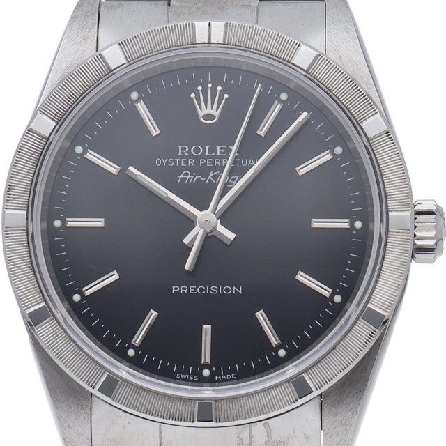 ロレックスの中でもシンプルでオーソドックなデザインが人気の「エアキング」。時計本来の性能を追求し、スタイルを選ばず使用できます。エンジンターンドベゼル仕様。