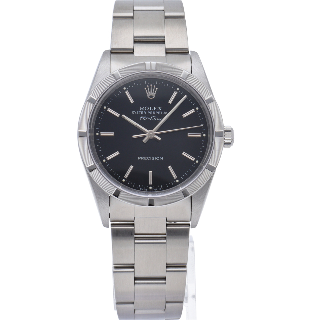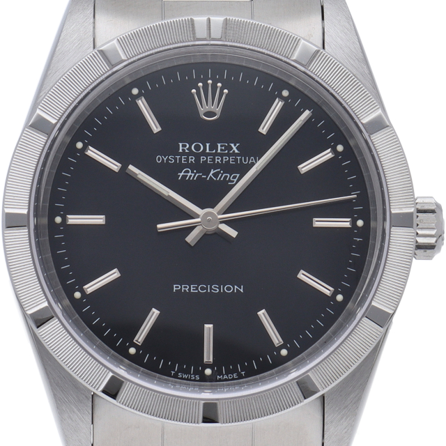 ロレックスの中でもシンプルでオーソドックなデザインが人気の「エアキング」。時計本来の性能を追求し、スタイルを選ばず使用できます。エンジンターンドベゼル仕様。
