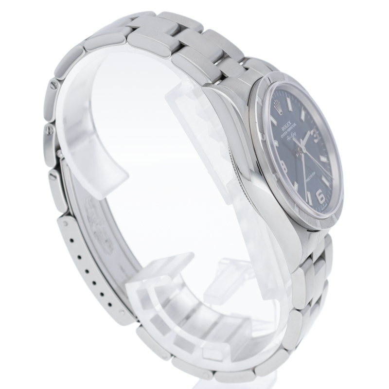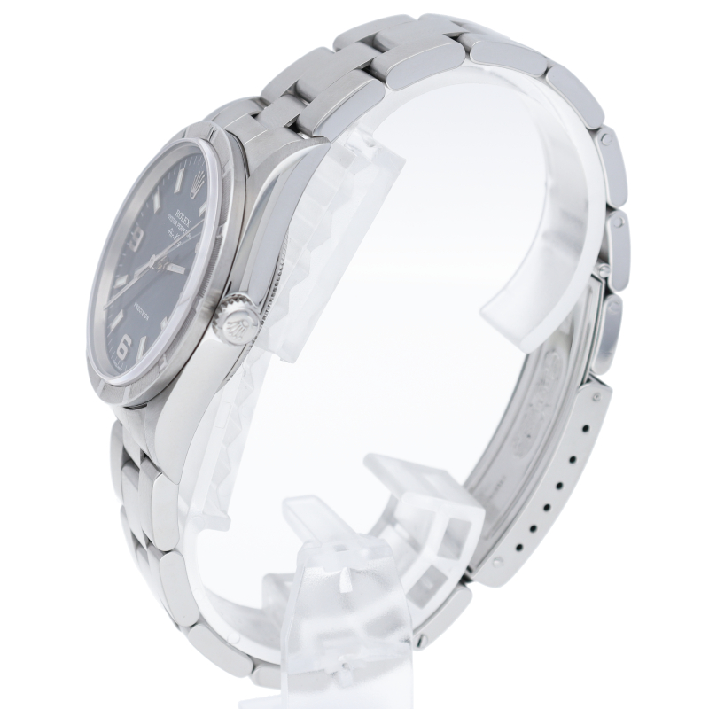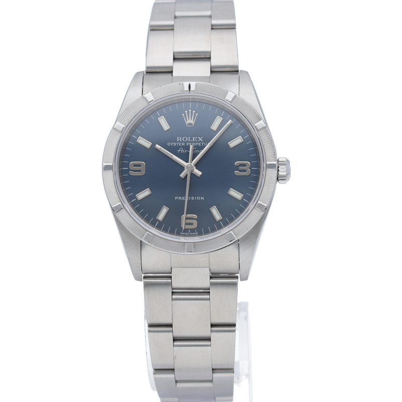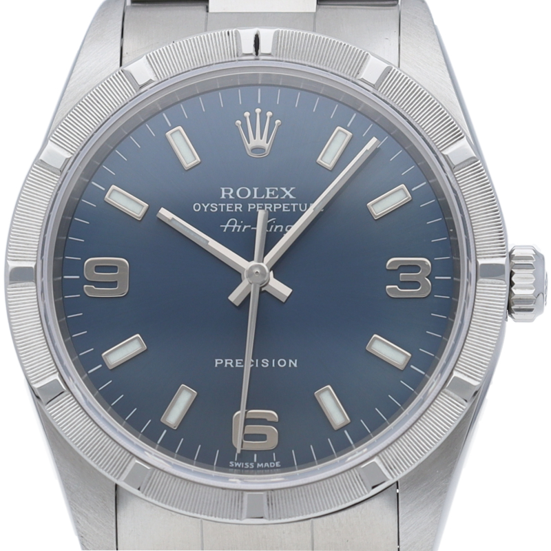 ロレックスの中でもシンプルでオーソドックなデザインが人気の「エアキング」。時計本来の性能を追求し、スタイルを選ばず使用できます。エンジンターンドベゼル仕様。