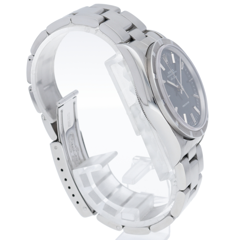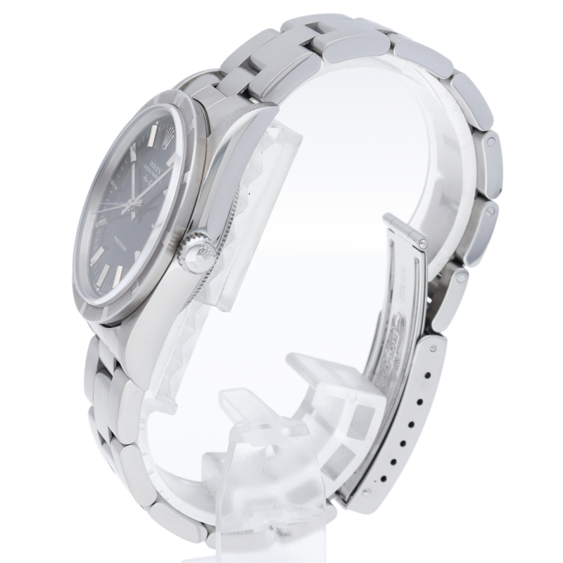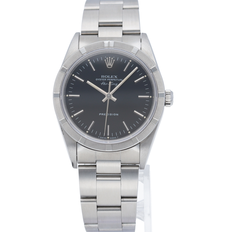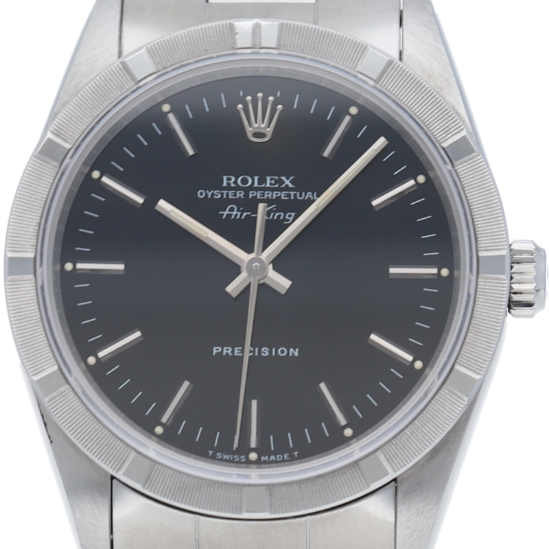 ロレックスの中でもシンプルでオーソドックなデザインが人気の「エアキング」。時計本来の性能を追求し、スタイルを選ばず使用できます。エンジンターンドベゼル仕様。