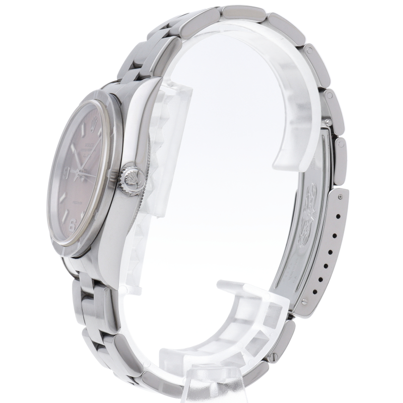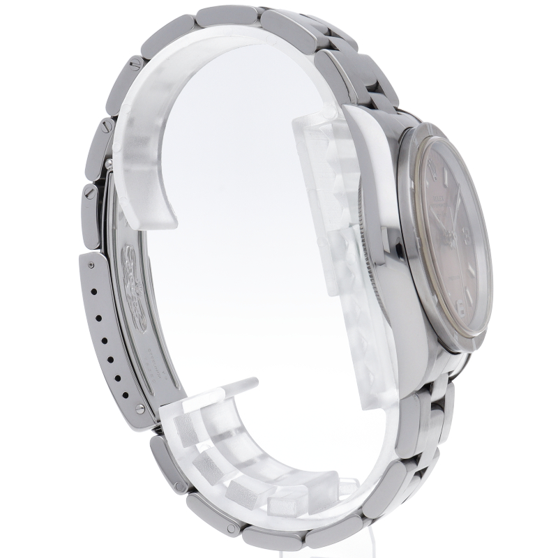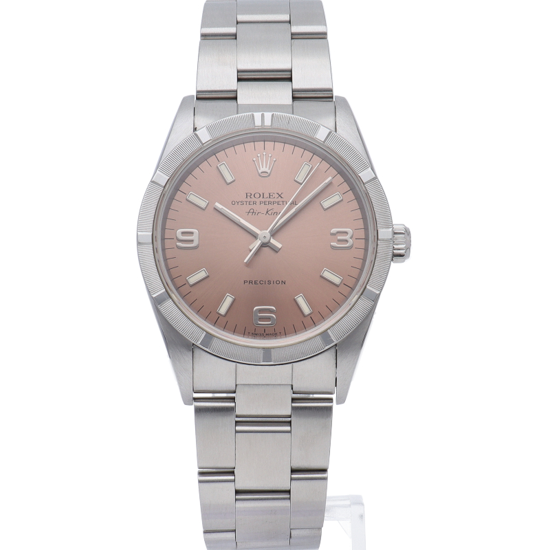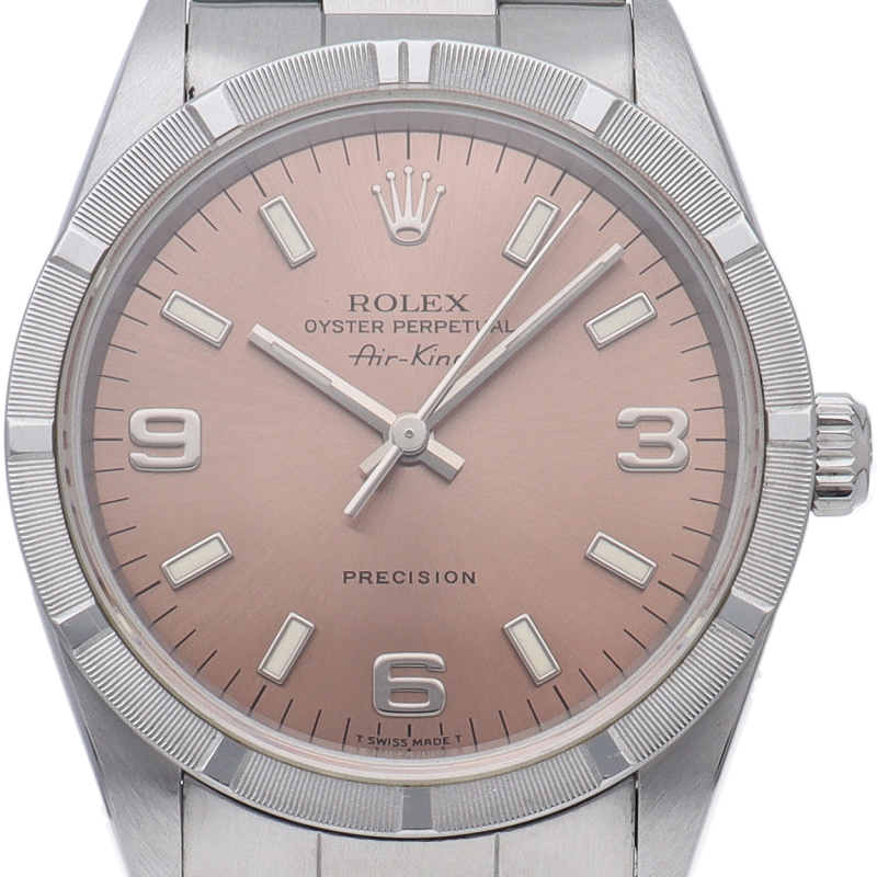 ロレックスの中でもシンプルでオーソドックなデザインが人気の「エアキング」。時計本来の性能を追求し、スタイルを選ばず使用できます。エンジンターンドベゼル仕様。