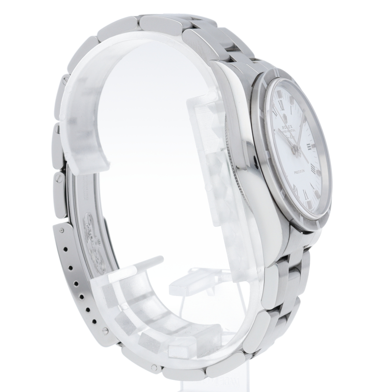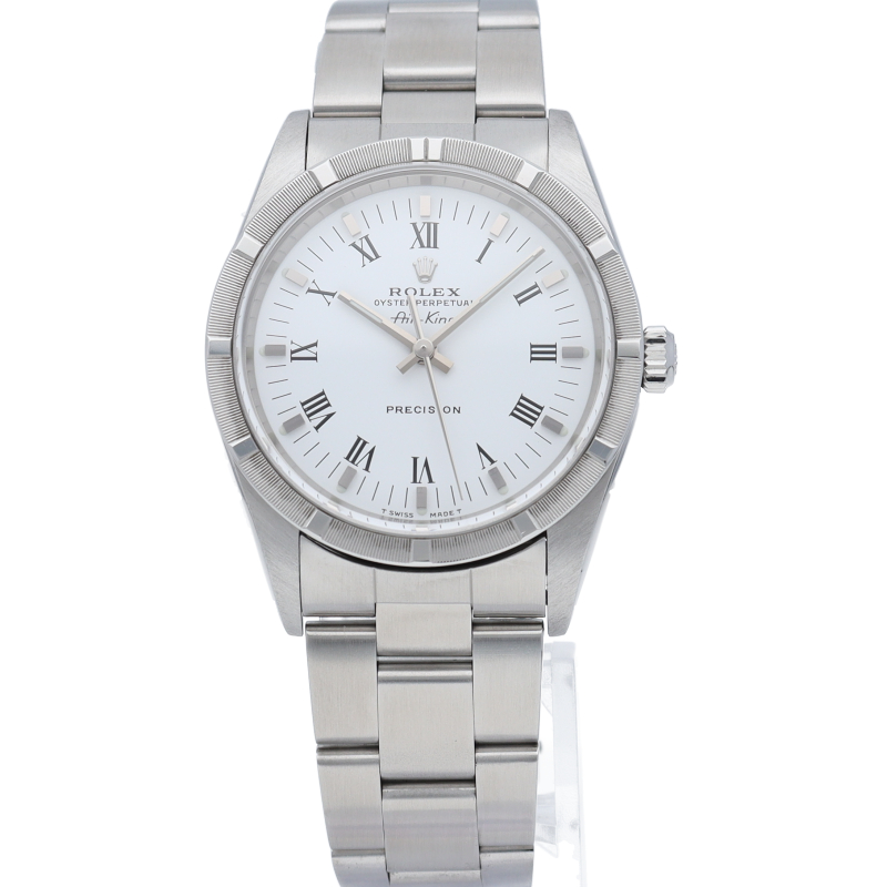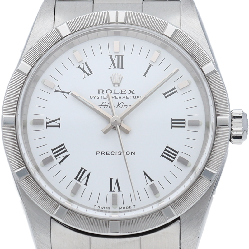 ロレックスの中でもシンプルでオーソドックなデザインが人気の「エアキング」。時計本来の性能を追求し、スタイルを選ばず使用できます。エンジンターンドベゼル仕様。
