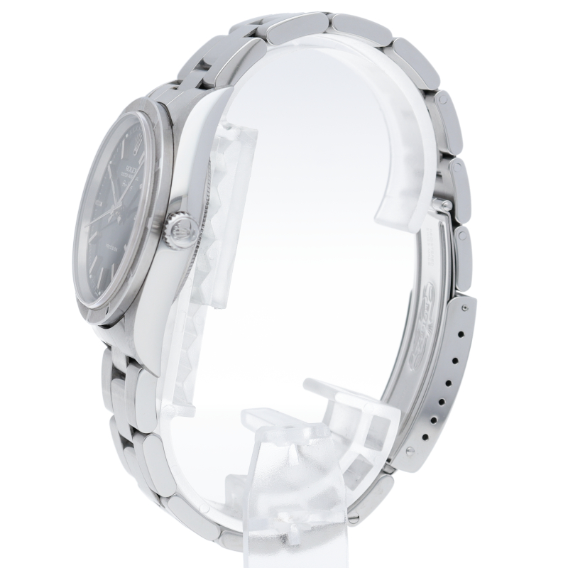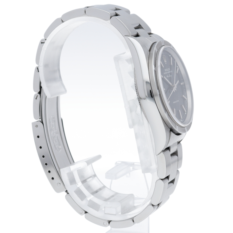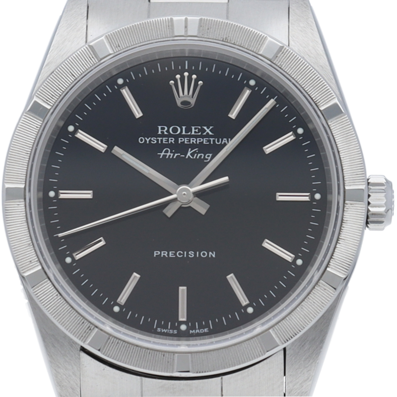 ロレックスの中でもシンプルでオーソドックなデザインが人気の「エアキング」。時計本来の性能を追求し、スタイルを選ばず使用できます。エンジンターンドベゼル仕様。