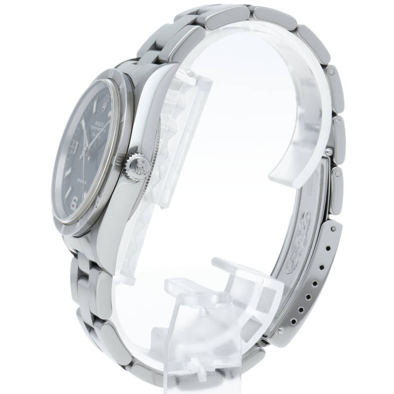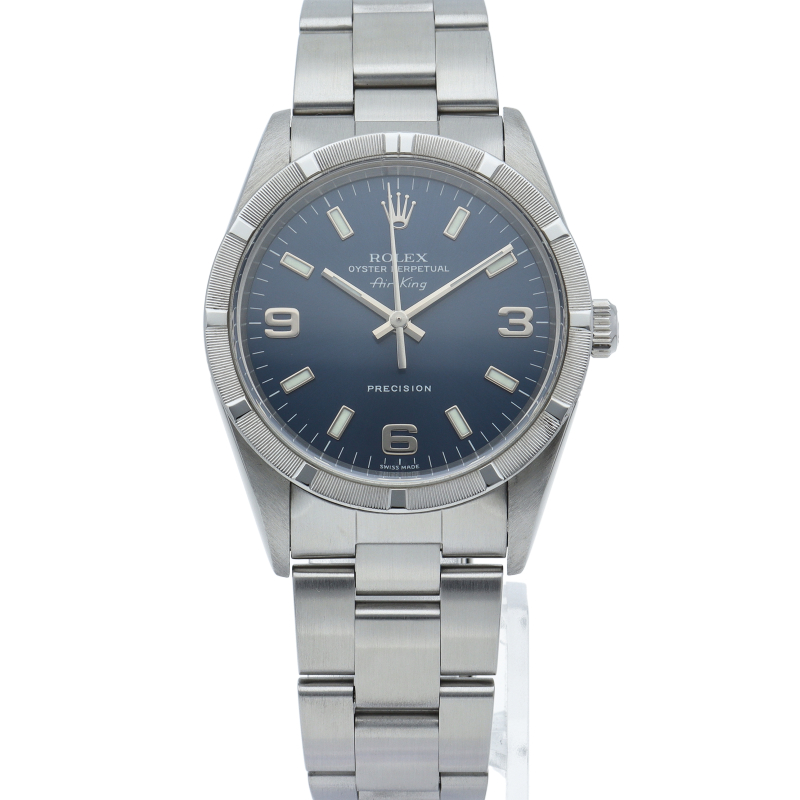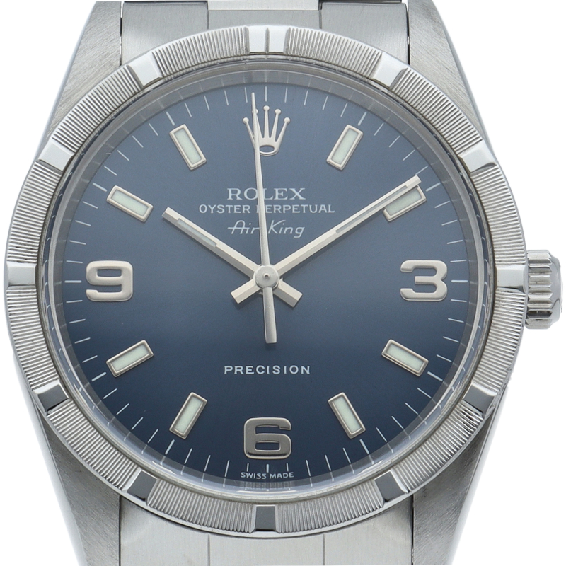 ロレックスの中でもシンプルでオーソドックなデザインが人気の「エアキング」。時計本来の性能を追求し、スタイルを選ばず使用できます。エンジンターンドベゼル仕様。