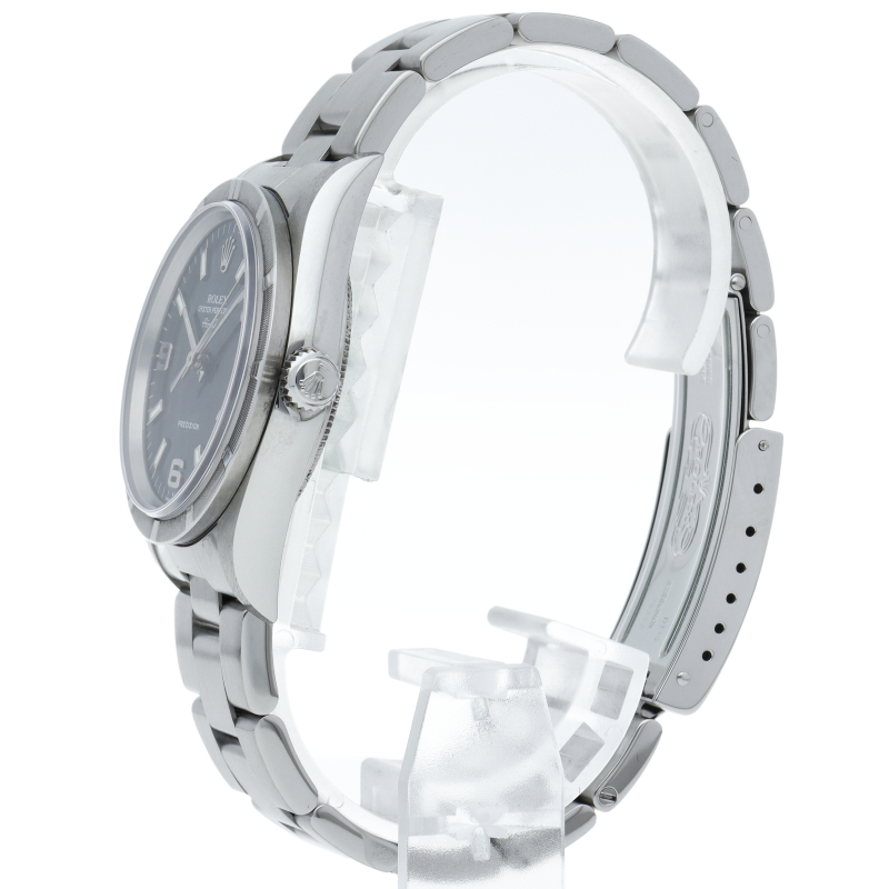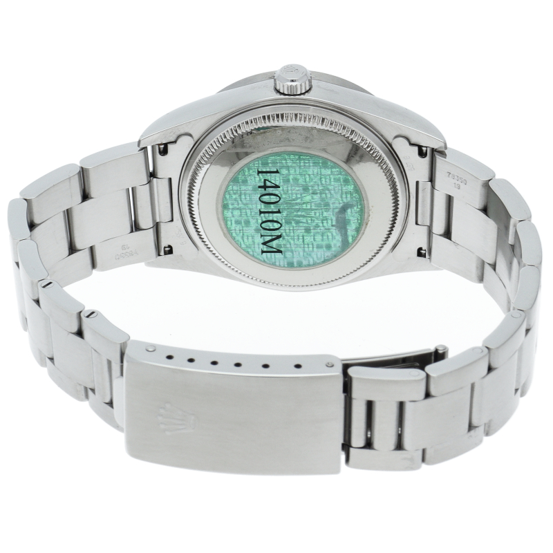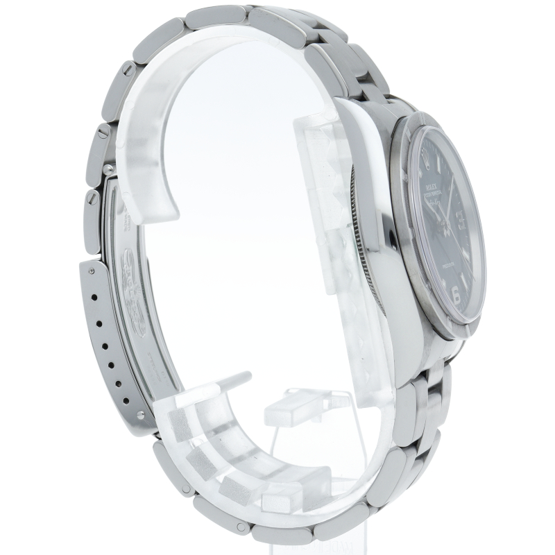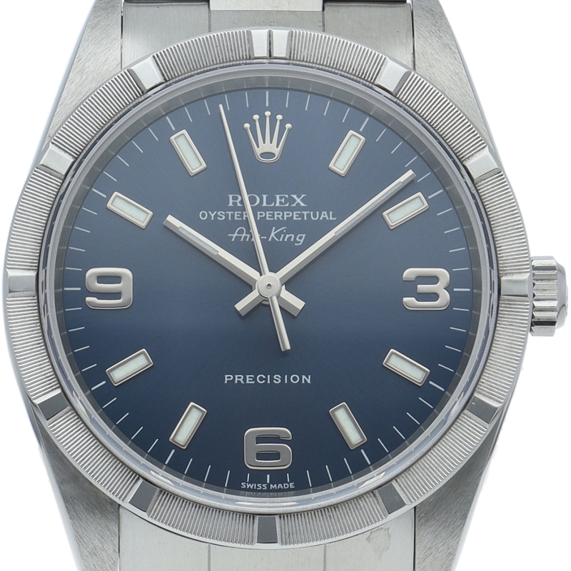 ロレックスの中でもシンプルでオーソドックなデザインが人気の「エアキング」。時計本来の性能を追求し、スタイルを選ばず使用できます。エンジンターンドベゼル仕様。