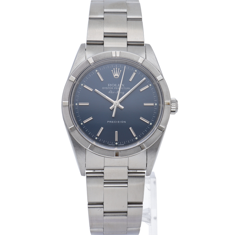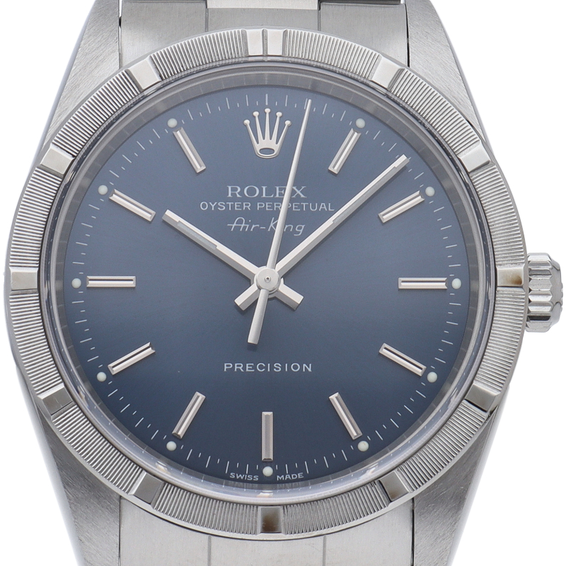 ロレックスの中でもシンプルでオーソドックなデザインが人気の「エアキング」。時計本来の性能を追求し、スタイルを選ばず使用できます。エンジンターンドベゼル仕様。