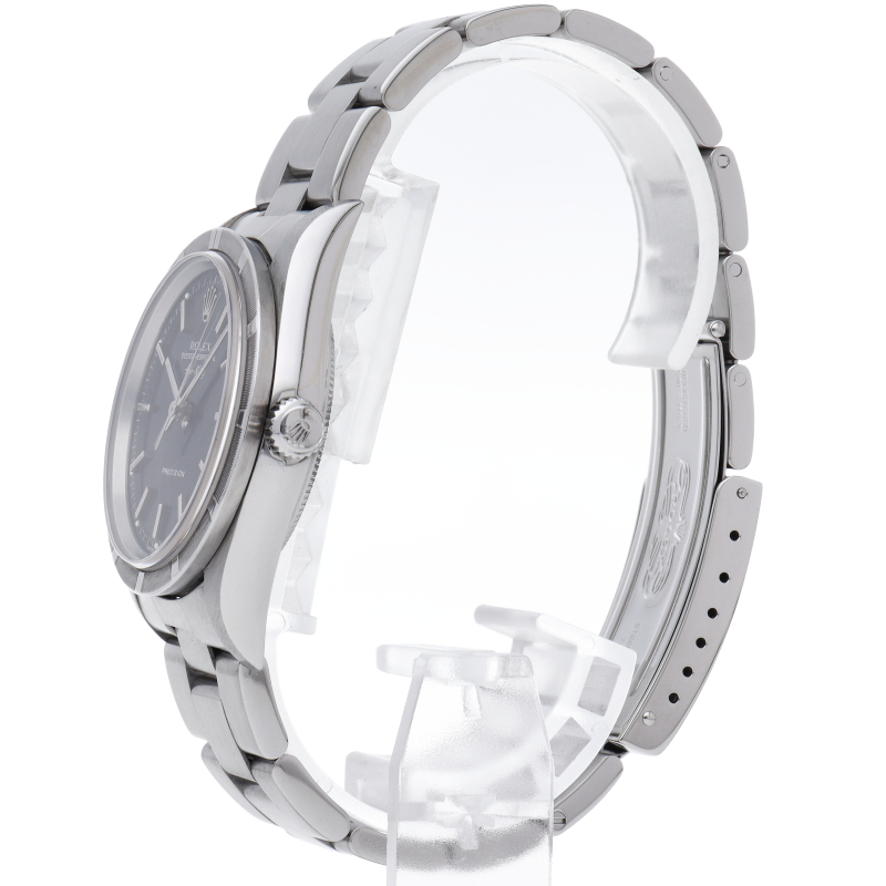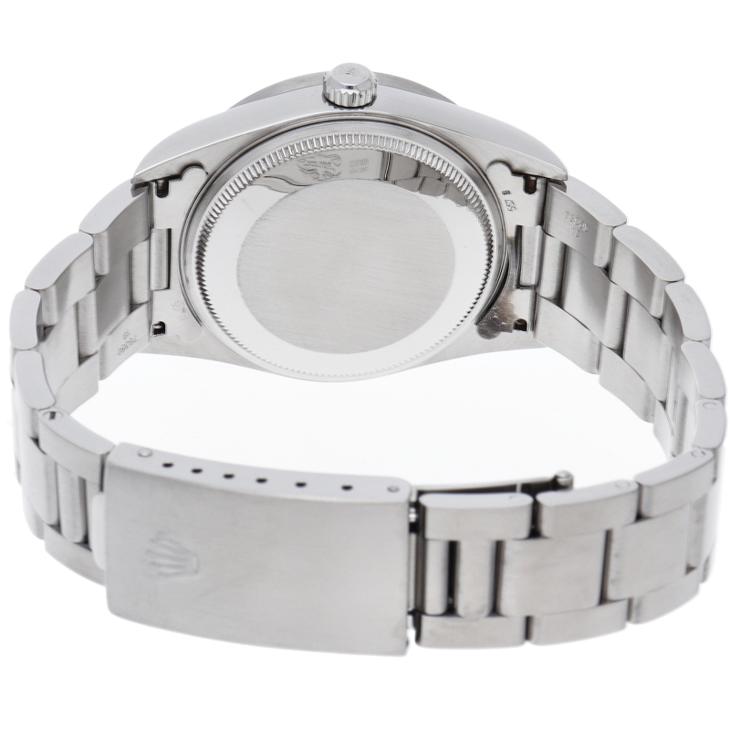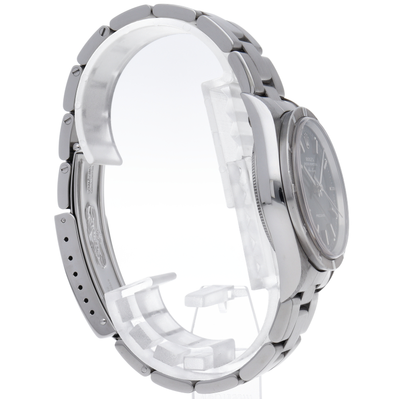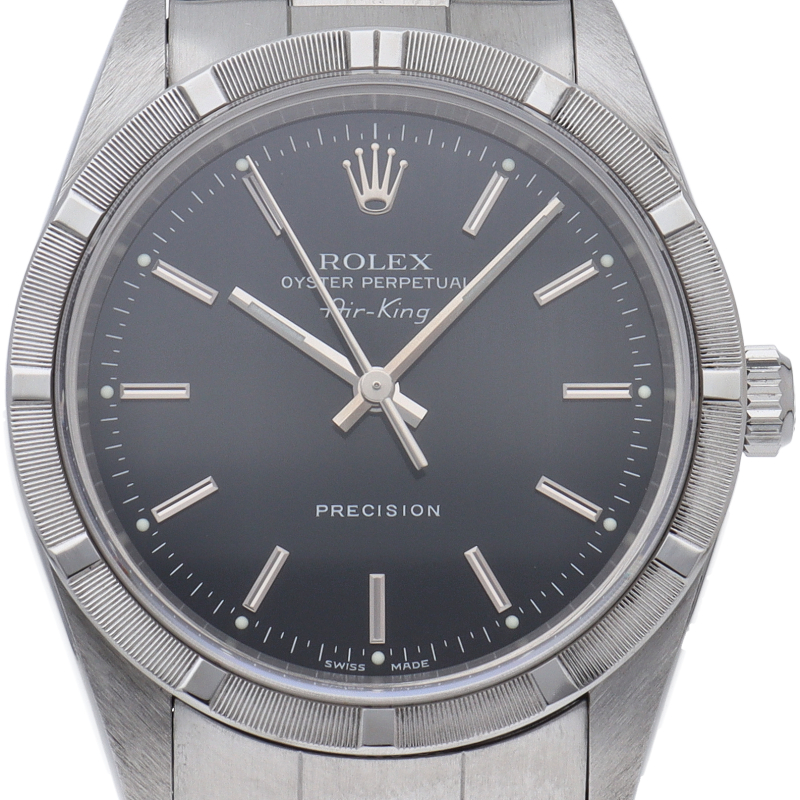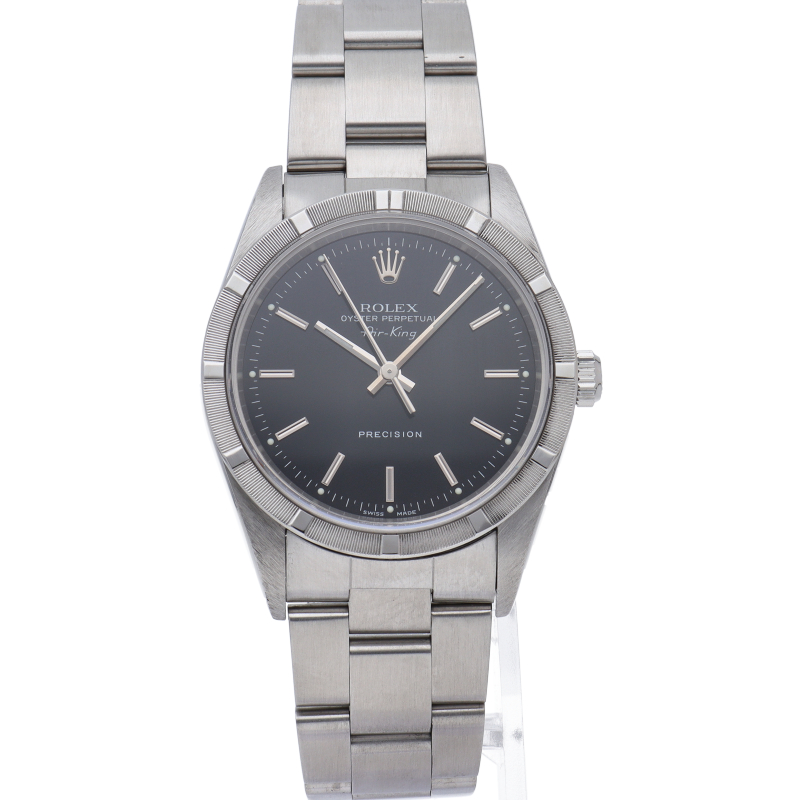 ロレックスの中でもシンプルでオーソドックなデザインが人気の「エアキング」。時計本来の性能を追求し、スタイルを選ばず使用できます。エンジンターンドベゼル仕様。