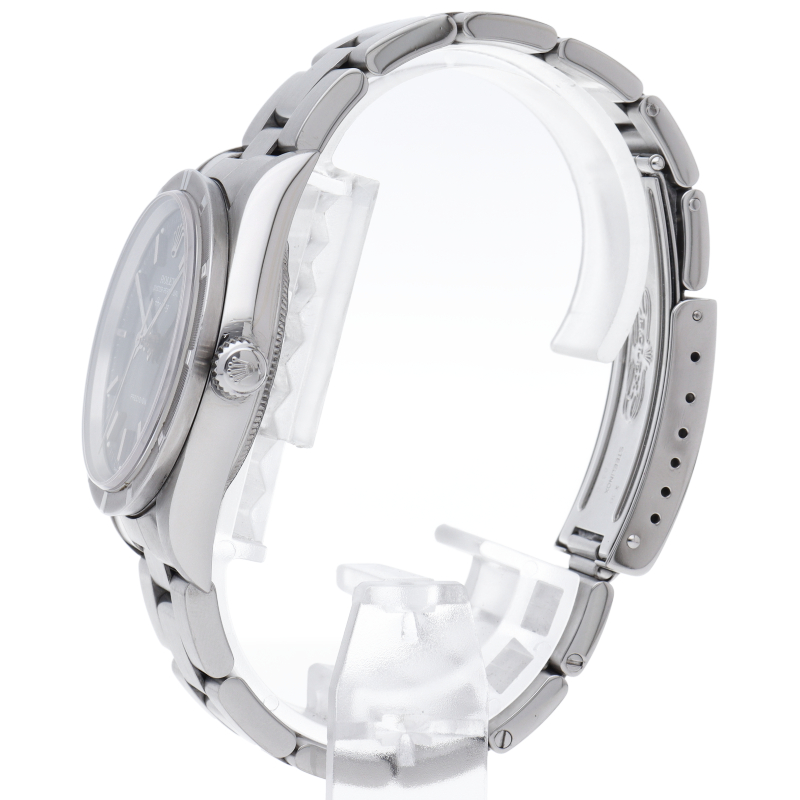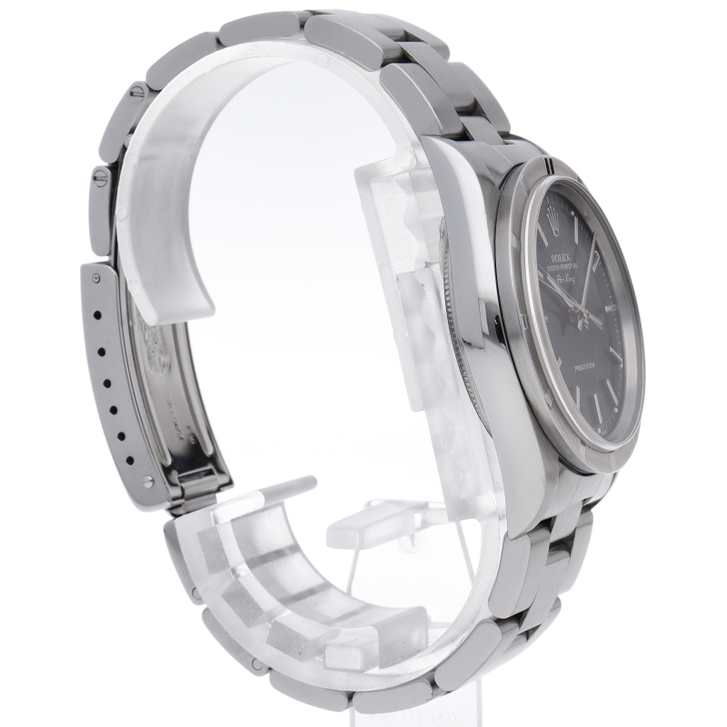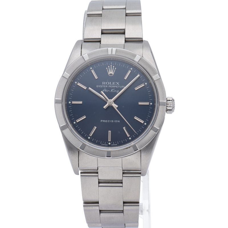 ロレックスの中でもシンプルでオーソドックなデザインが人気の「エアキング」。時計本来の性能を追求し、スタイルを選ばず使用できます。エンジンターンドベゼル仕様。