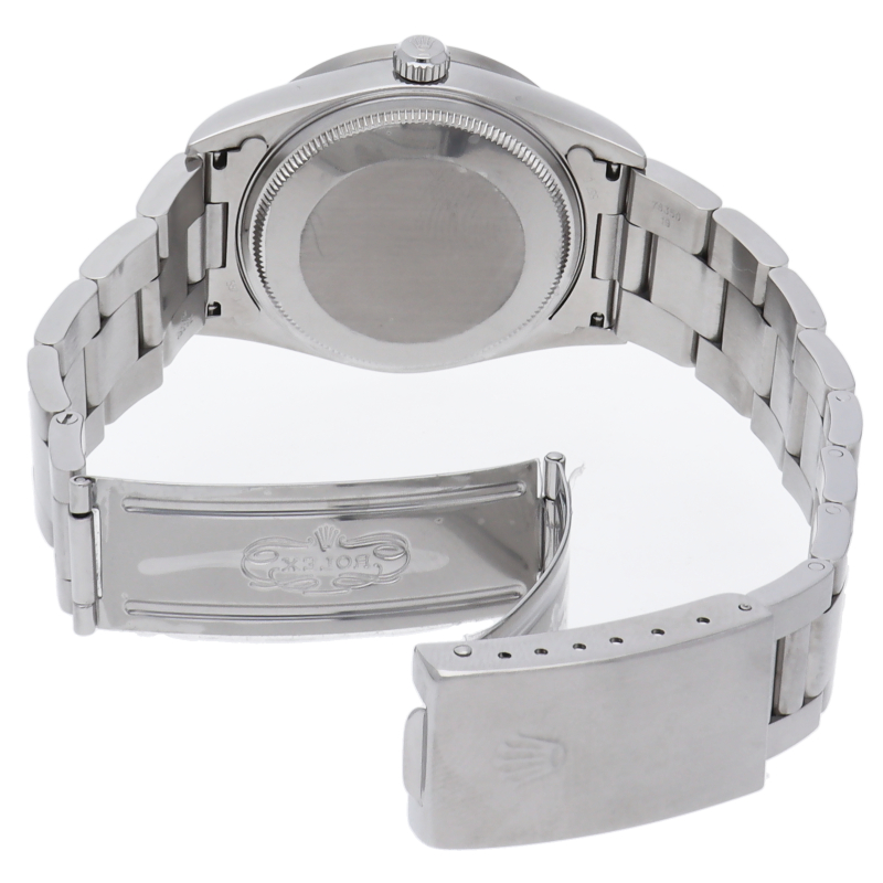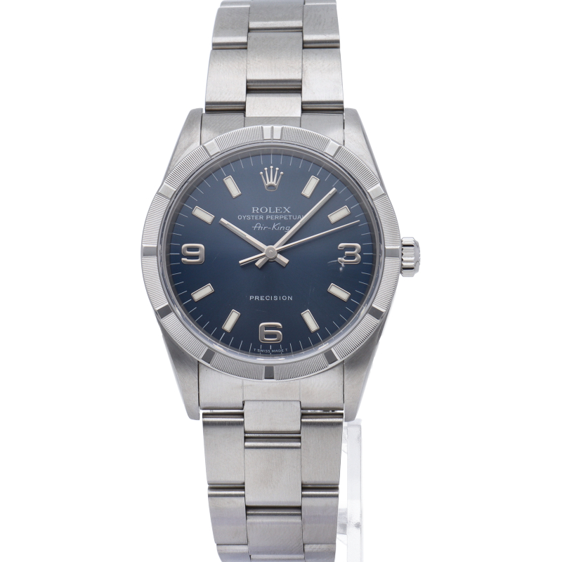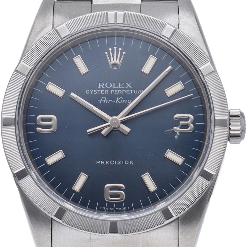 ロレックスの中でもシンプルでオーソドックなデザインが人気の「エアキング」。時計本来の性能を追求し、スタイルを選ばず使用できます。エンジンターンドベゼル仕様。