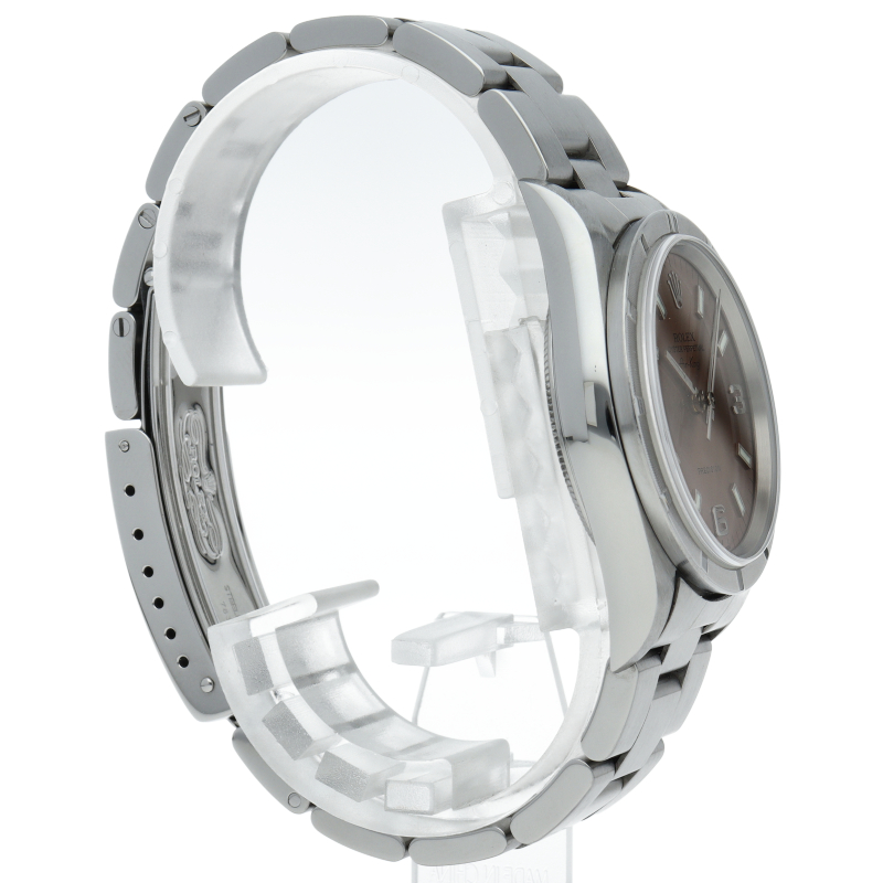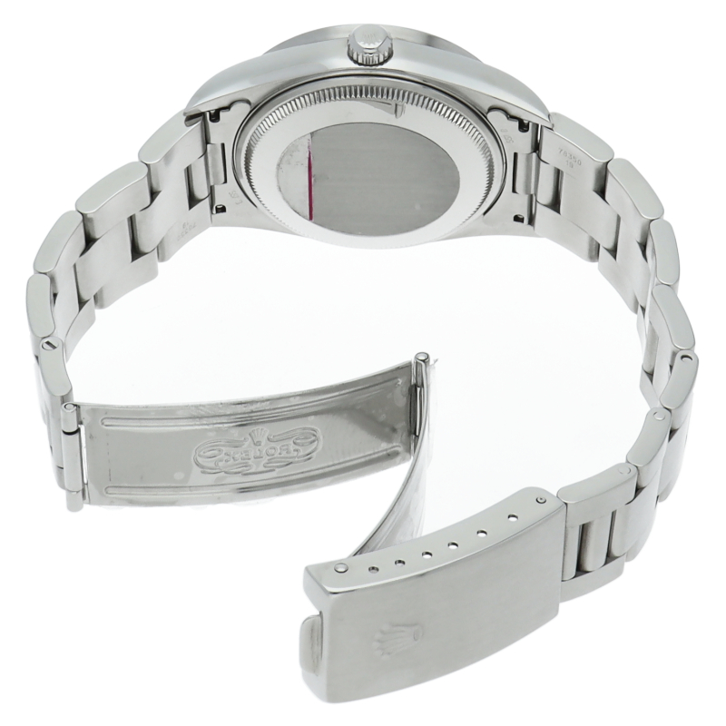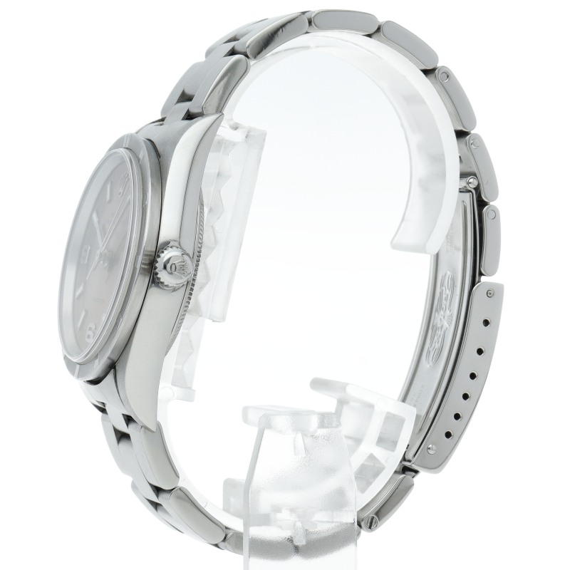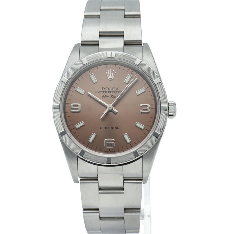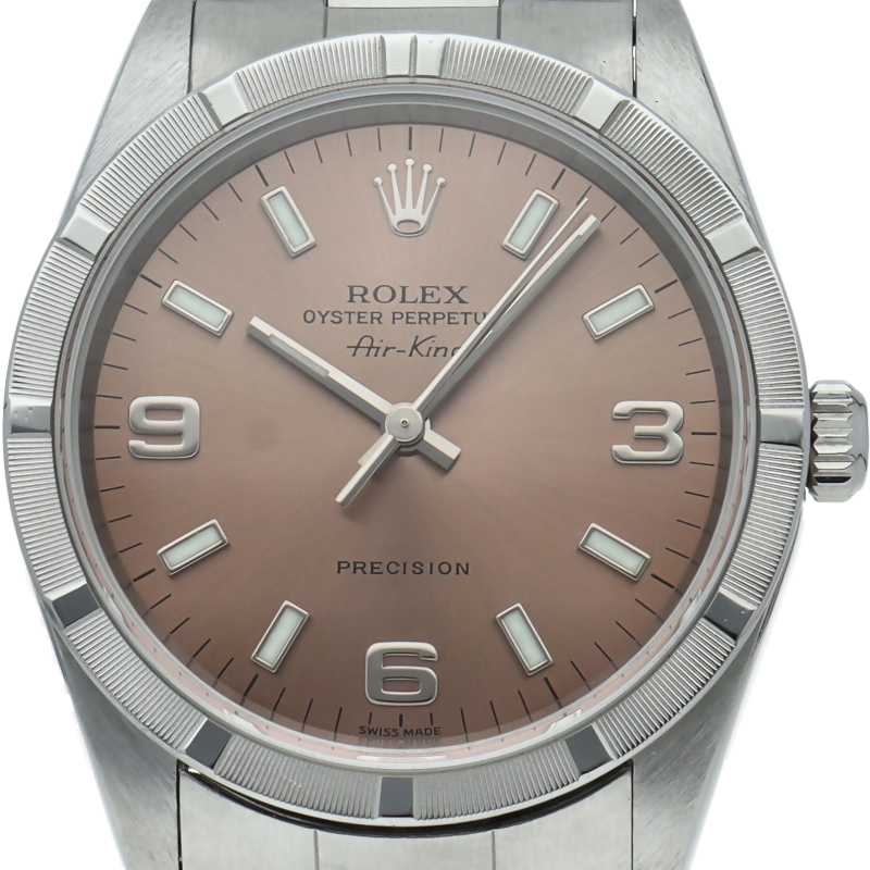 ロレックスの中でもシンプルでオーソドックなデザインが人気の「エアキング」。時計本来の性能を追求し、スタイルを選ばず使用できます。エンジンターンドベゼル仕様。