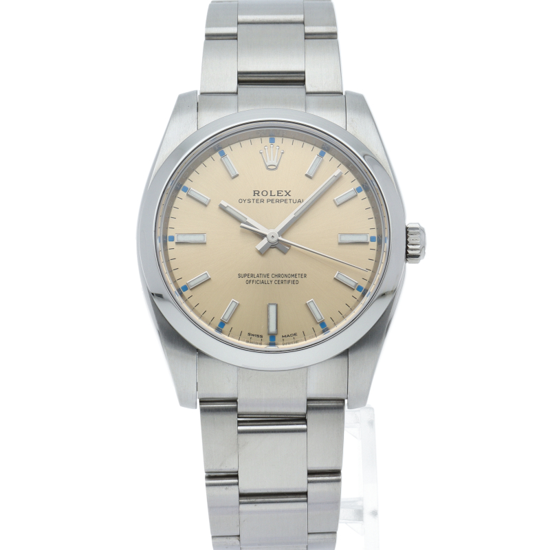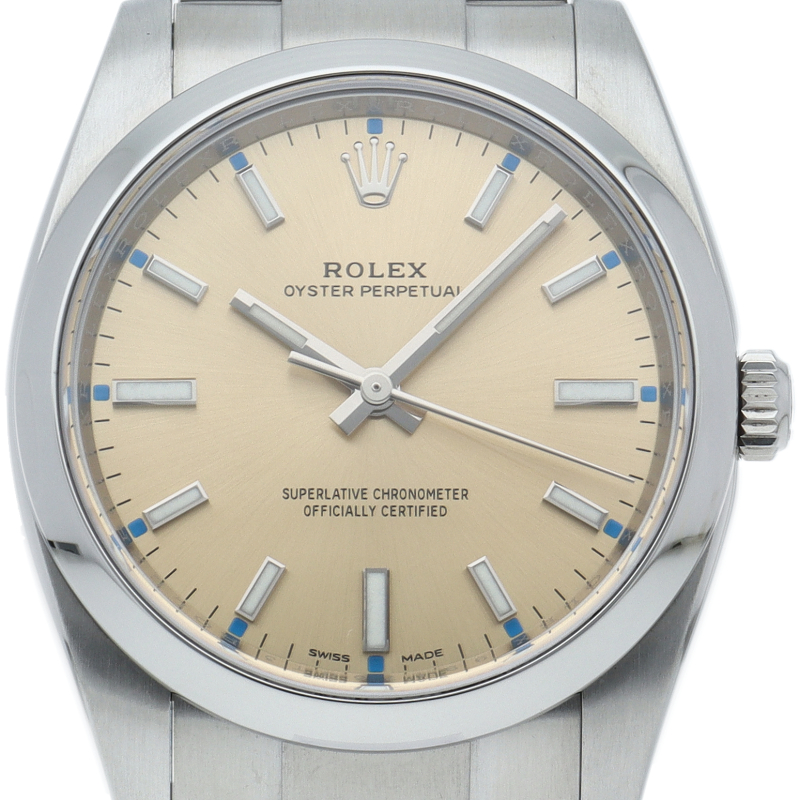 ロレックスの中でもシンプルな3針で時計本来の機能を追求した「オイスターパーペチュアル」。すでに、廃盤となりましたが、程よりサイズが人気のモデルです。