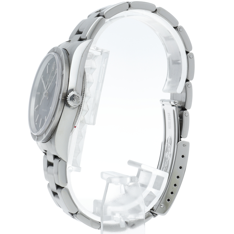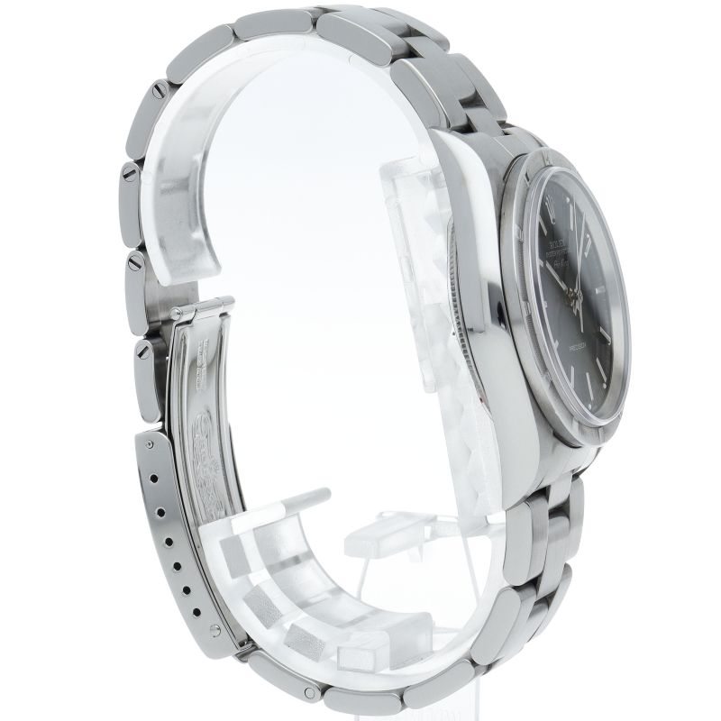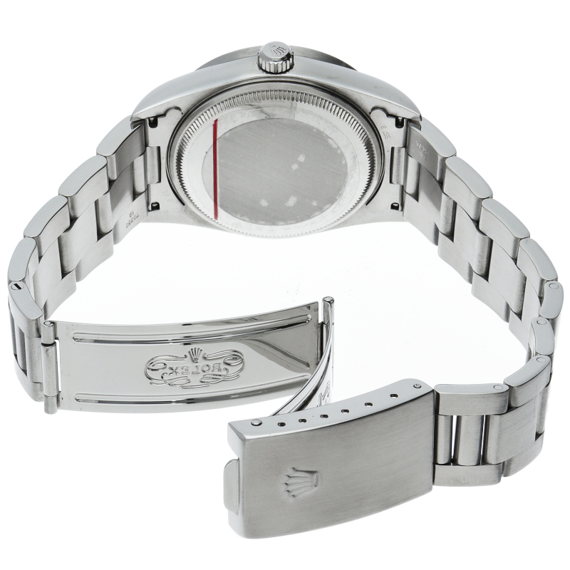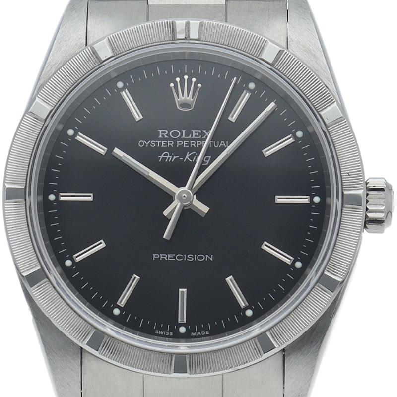 ロレックスの中でもシンプルでオーソドックなデザインが人気の「エアキング」。時計本来の性能を追求し、スタイルを選ばず使用できます。エンジンターンドベゼル仕様。
