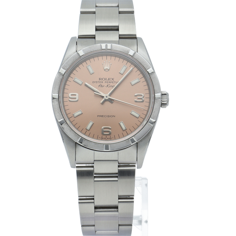 ロレックスの中でもシンプルでオーソドックなデザインが人気の「エアキング」。時計本来の性能を追求し、スタイルを選ばず使用できます。エンジンターンドベゼル仕様。