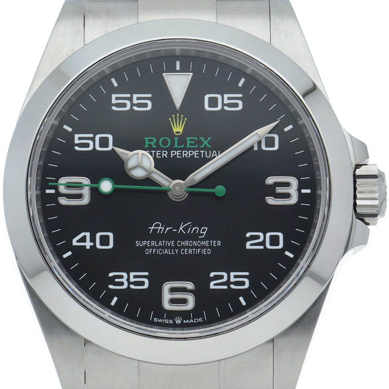 2022年発表のニューモデル、Ref.126900「オイスターパーペチュアル エアキング」。飛躍的に航空技術が進歩した1930年代に高精度を求めるパイロットに愛されていたオイスターモデルをオマージュして製造されたパイロットウォッチです。