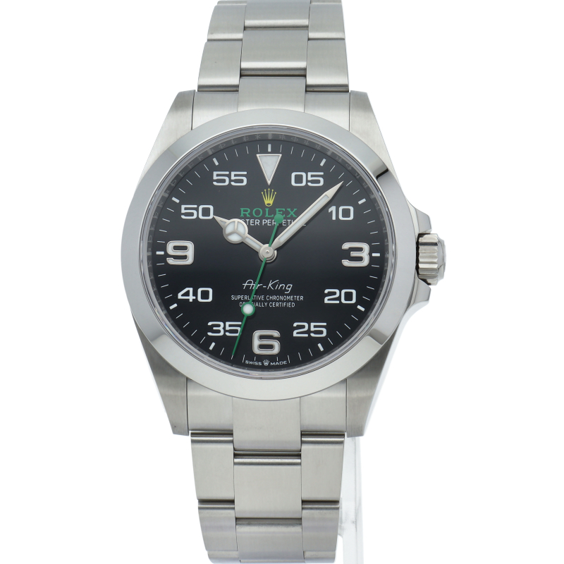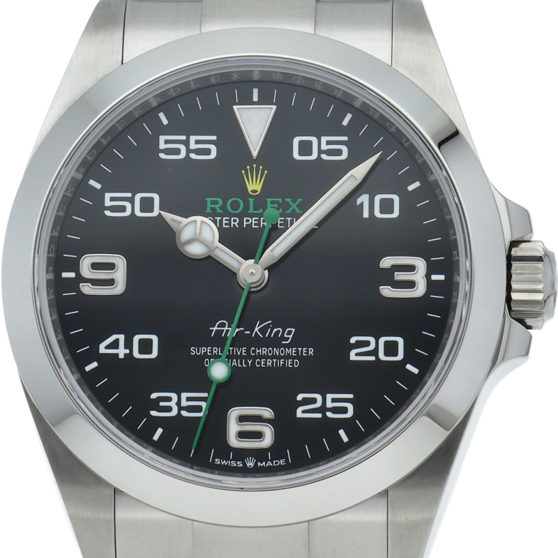 2022年発表のニューモデル、Ref.126900「オイスターパーペチュアル エアキング」。飛躍的に航空技術が進歩した1930年代に高精度を求めるパイロットに愛されていたオイスターモデルをオマージュして製造されたパイロットウォッチです。