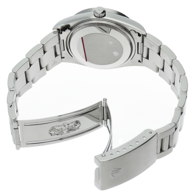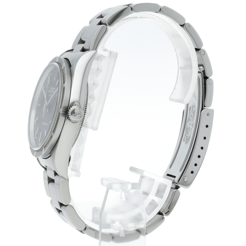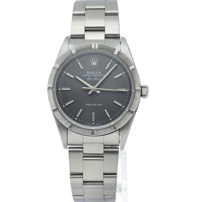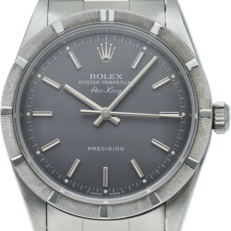 ロレックスの中でもシンプルでオーソドックなデザインが人気の「エアキング」。時計本来の性能を追求し、スタイルを選ばず使用できます。エンジンターンドベゼル仕様。