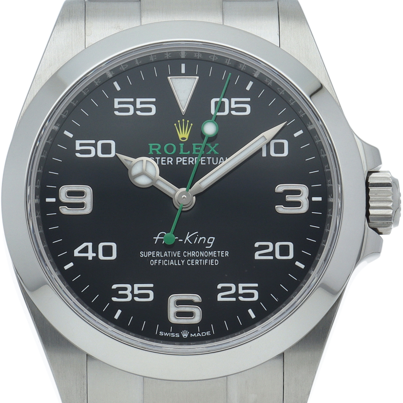 2022年発表のニューモデル、Ref.126900「オイスターパーペチュアル エアキング」。飛躍的に航空技術が進歩した1930年代に高精度を求めるパイロットに愛されていたオイスターモデルをオマージュして製造されたパイロットウォッチです。