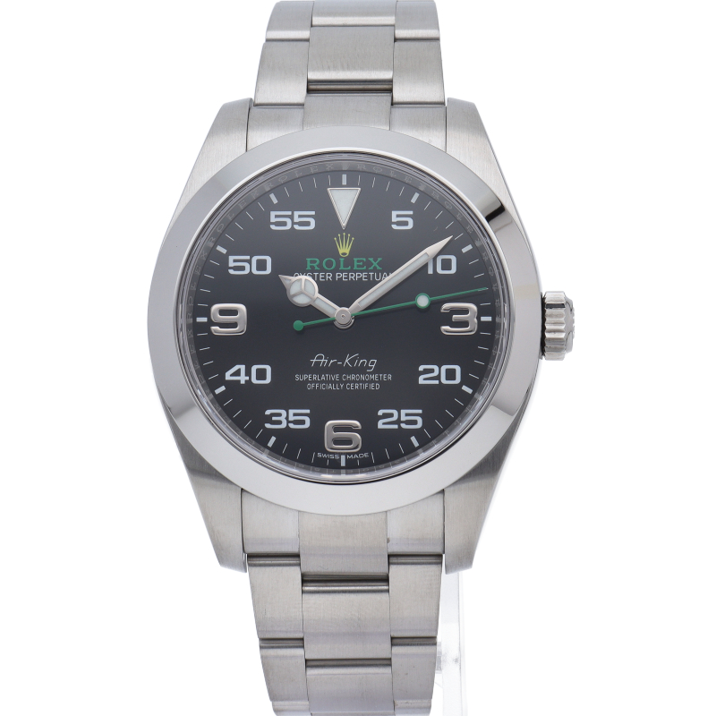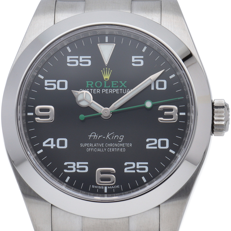 2016年発表のニューモデル、Ref.116900「オイスターパーペチュアル エアキング」。飛躍的に航空技術が進歩した1930年代に高精度を求めるパイロットに愛されていたオイスターモデルをオマージュして製造されたパイロットウォッチです。