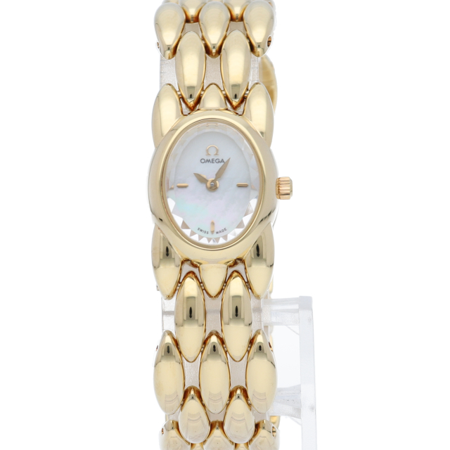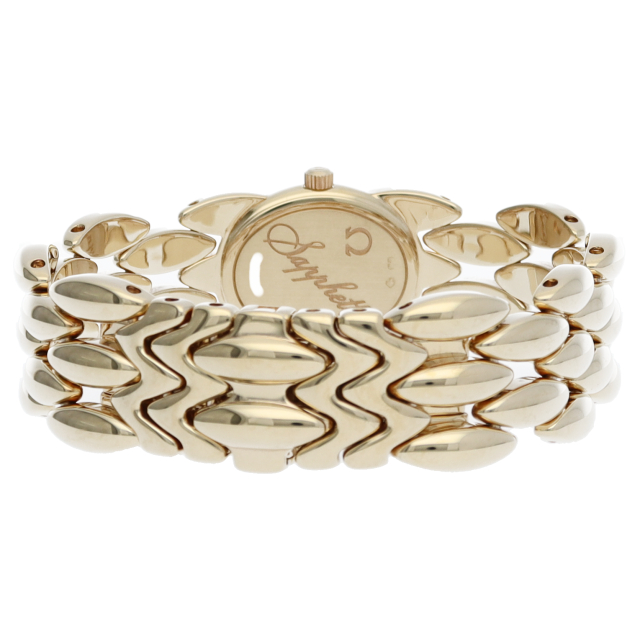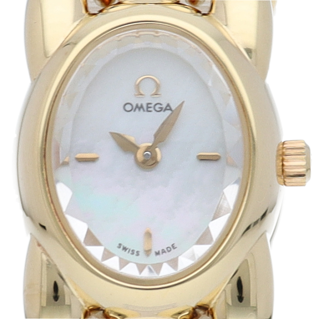 オメガのイエローゴールド素材にダイヤモンドを贅沢に使用したドレスウォッチです。フェイスガラスを特殊にカットデザインし、上品な雰囲気を漂わせています。