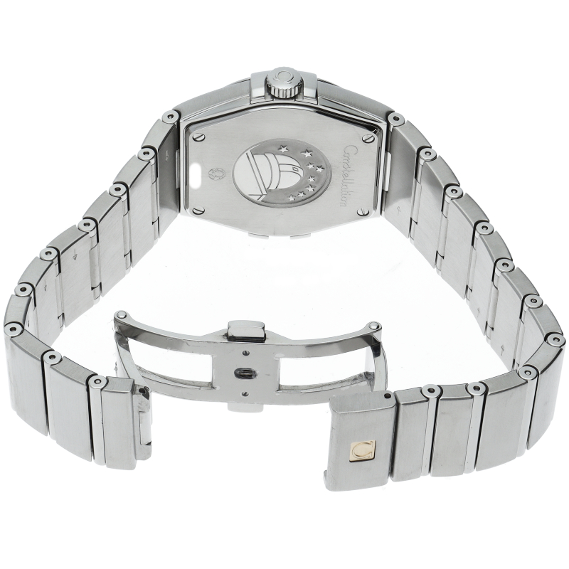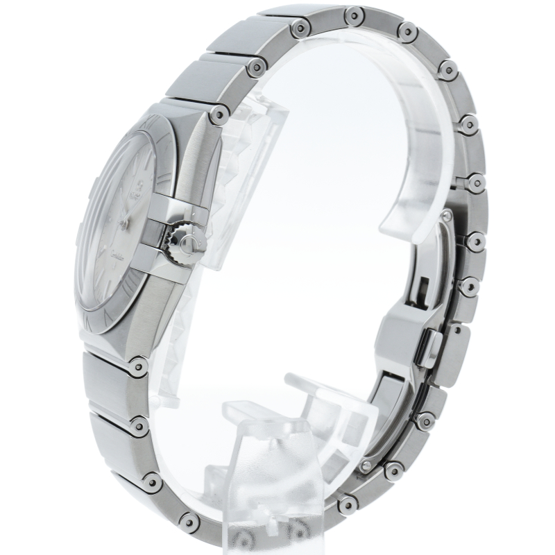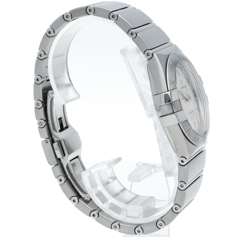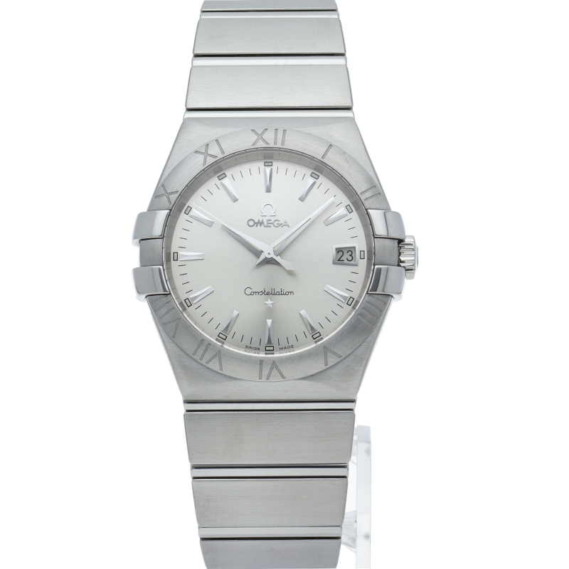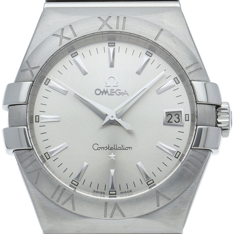 オメガを代表するドレスウォッチ「コンステレーション」。このモデルのシルバーダイアルの3時位置には日付窓が配置され、傷の付きにくいサファイア・クリスタル ガラスで覆われています。直径35mmのステンレススティール製ケースには、ローマ数字が刻印されたべゼルと、ステンレススティール製ブレスレットが取り付けられています。