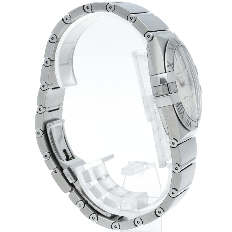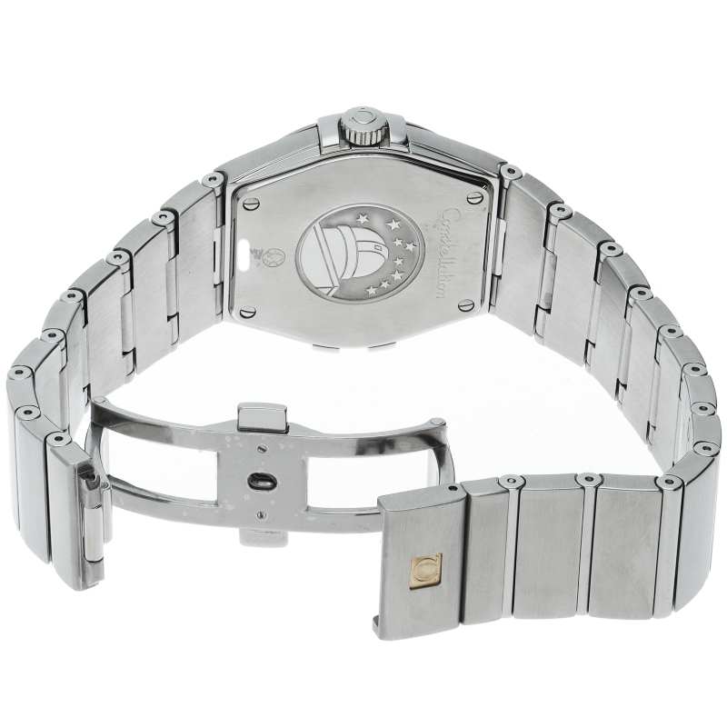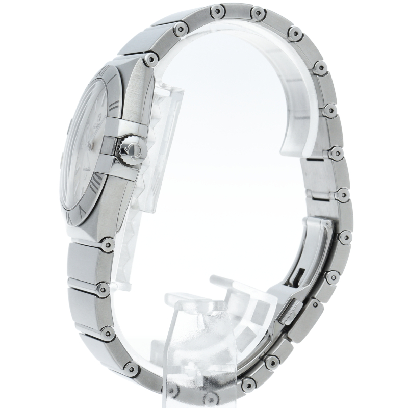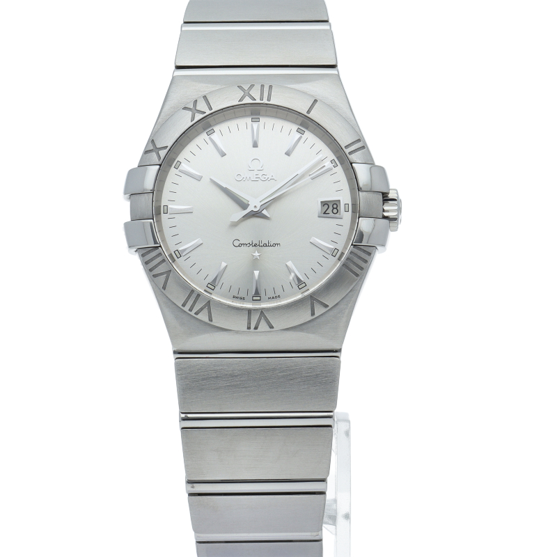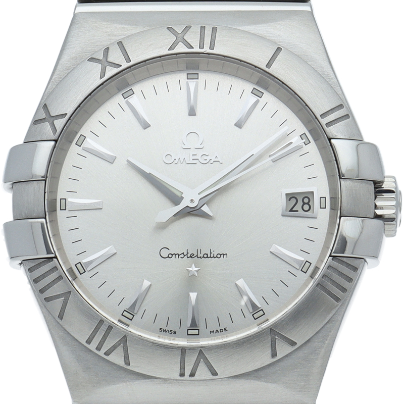 オメガを代表するドレスウォッチ「コンステレーション」。このモデルのシルバーダイアルの3時位置には日付窓が配置され、傷の付きにくいサファイア・クリスタル ガラスで覆われています。直径35mmのステンレススティール製ケースには、ローマ数字が刻印されたべゼルと、ステンレススティール製ブレスレットが取り付けられています。