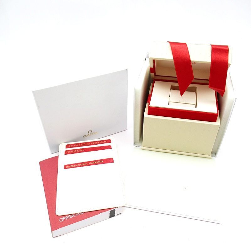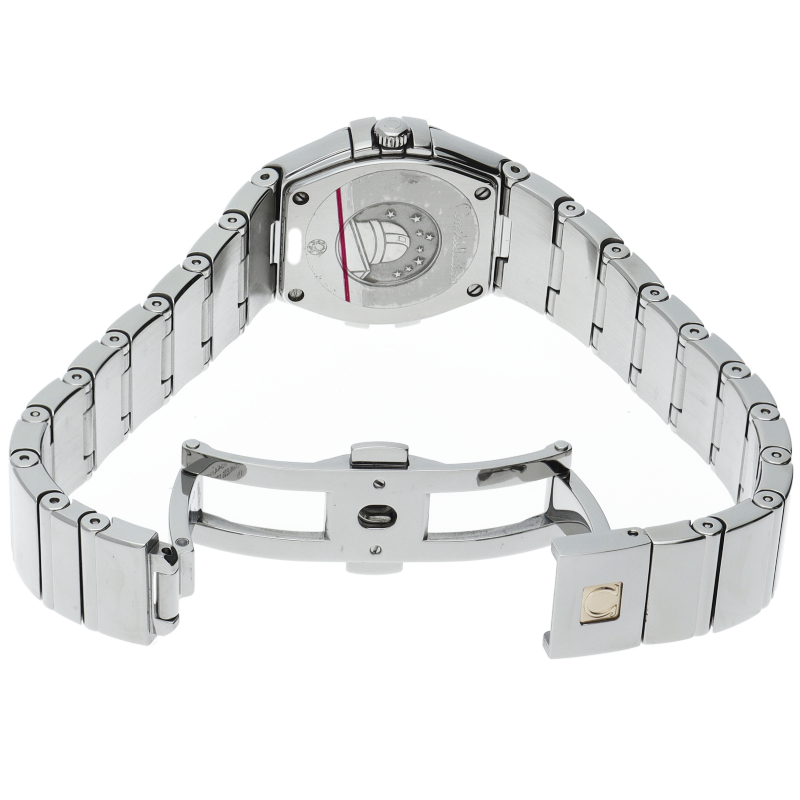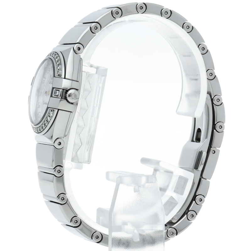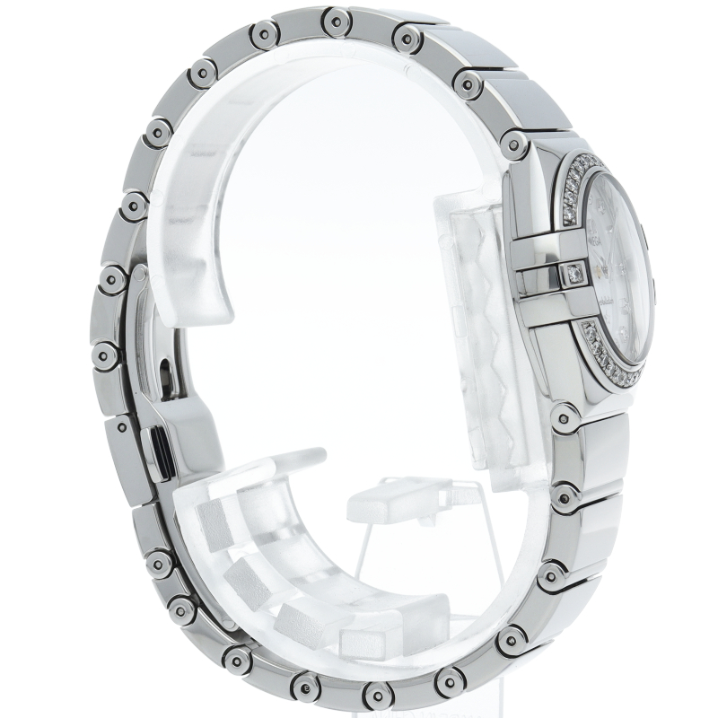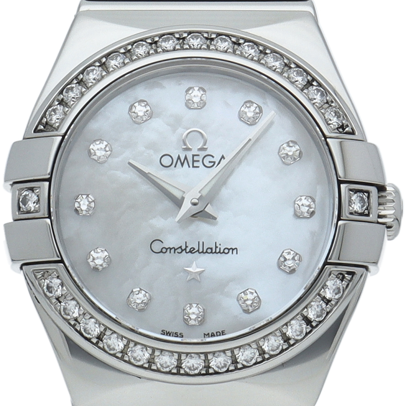 オメガを代表するドレスウォッチ「コンステレーション」。ベゼルにダイヤを配したラグジュアリーなモデルです。ホワイトシェルの文字盤はダイヤモンドとの相性も抜群です。可愛らしいミニサイズ。