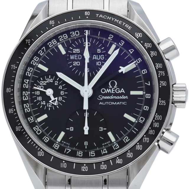 オメガの人気「スピードマスター」。クロノグラフ、月・日・曜日表示機能がついた便利な多機能ウォッチ。スタイルを選ばずにご使用いただける便利な1本。