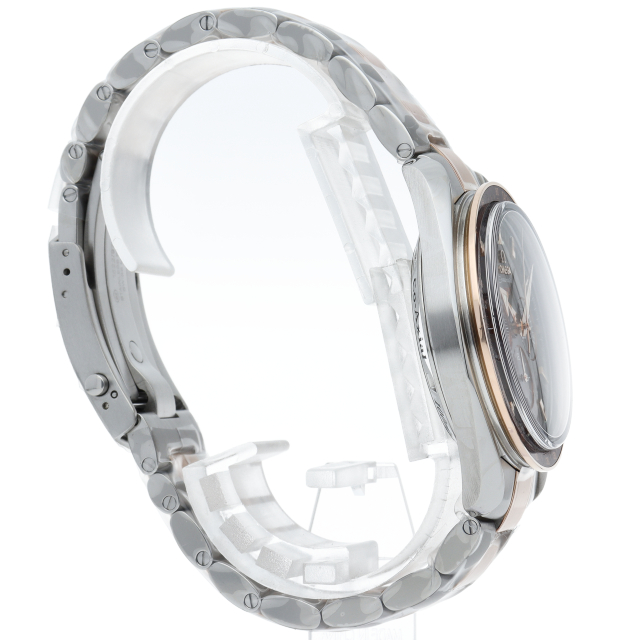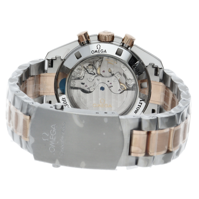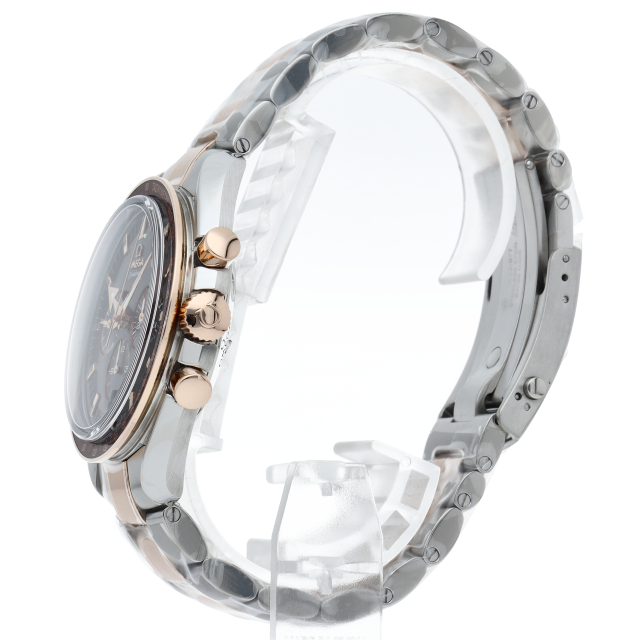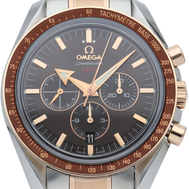オメガのスピードマスター生誕50周年記念モデルです。レッドゴールドとステンレスのコンビモデルで、ブラウンダイアルにはスピードマスター誕生年の1957が赤字でプリントされています。ムーブメントにはコーアクシャル・コラムホイール式クロノグラフムーブメントの3313が搭載されています。