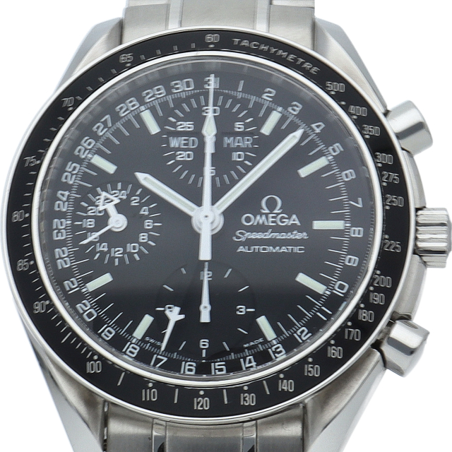 オメガの人気「スピードマスター」。クロノグラフ、月・日・曜日表示機能がついた便利な多機能ウォッチ。スタイルを選ばずにご使用いただける便利な1本。