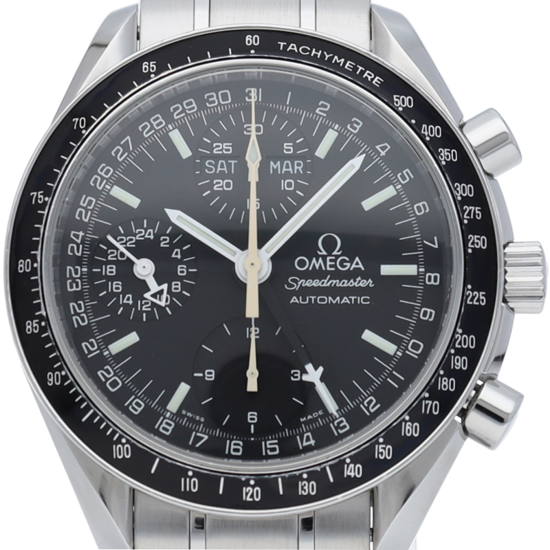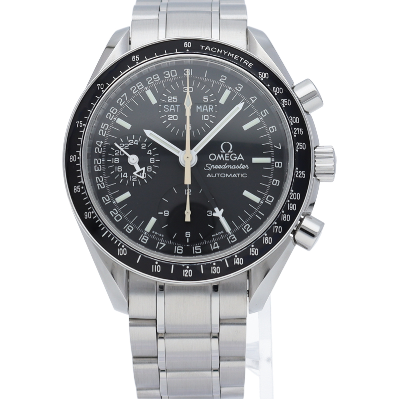 オメガの人気「スピードマスター」。クロノグラフ、月・日・曜日表示機能がついた便利な多機能ウォッチ。スタイルを選ばずにご使用いただける便利な1本。