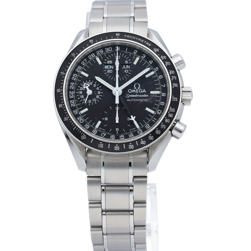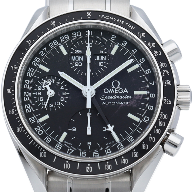 オメガの人気「スピードマスター」。クロノグラフ、月・日・曜日表示機能がついた便利な多機能ウォッチ。スタイルを選ばずにご使用いただける便利な1本。