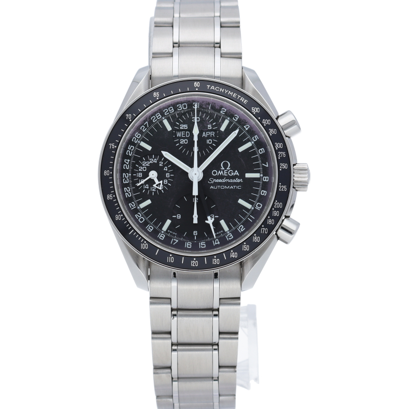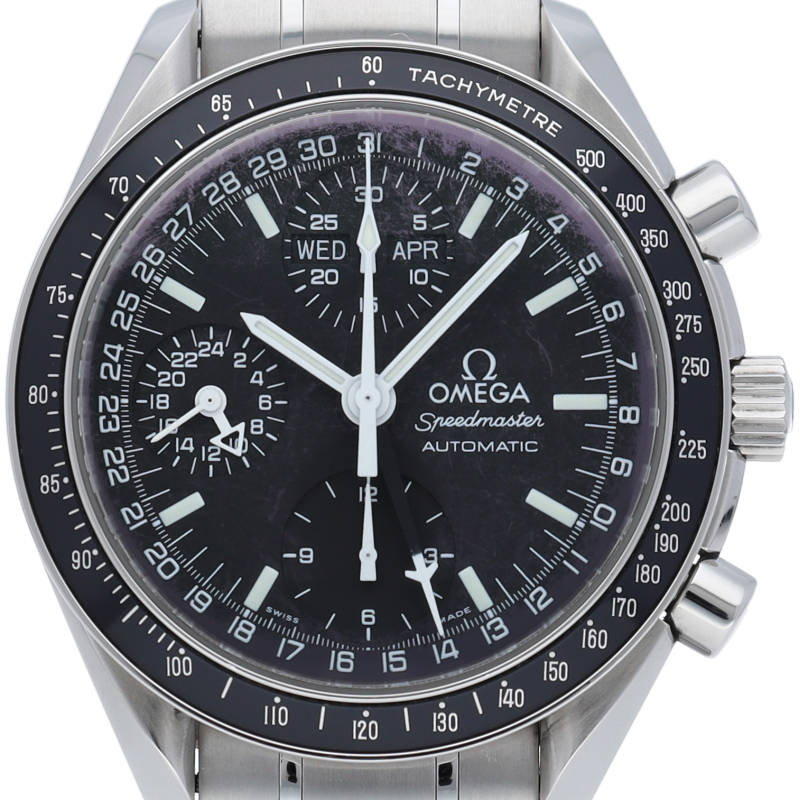 オメガの人気「スピードマスター」。クロノグラフ、月・日・曜日表示機能がついた便利な多機能ウォッチ。スタイルを選ばずにご使用いただける便利な1本。