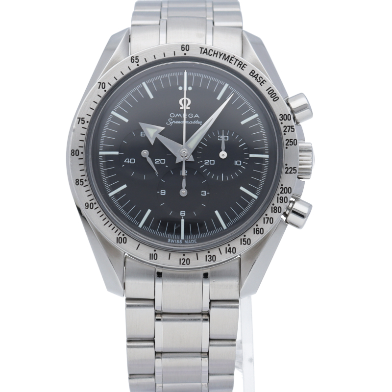 初代スピードマスターの復刻版「ファースト・レプリカ」。アロー針やプラ風防等初代スピードマスターをよく再現したアンティーク風味のある1本。