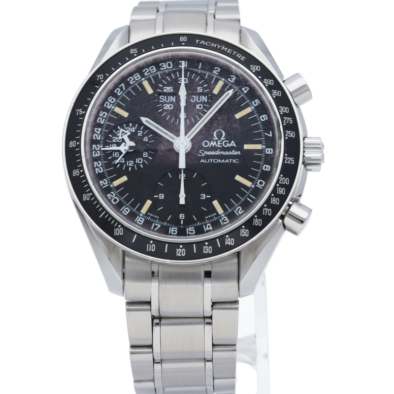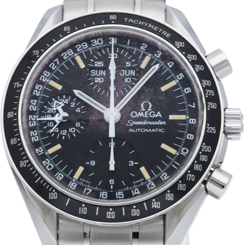 オメガの人気「スピードマスター」。クロノグラフ、月・日・曜日表示機能がついた便利な多機能ウォッチ。スタイルを選ばずにご使用いただける便利な1本。