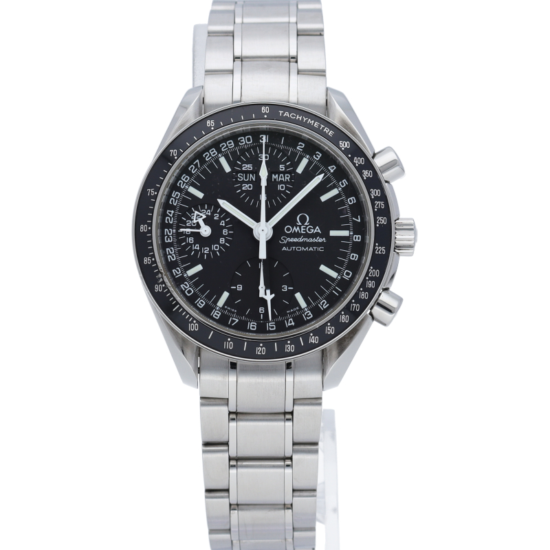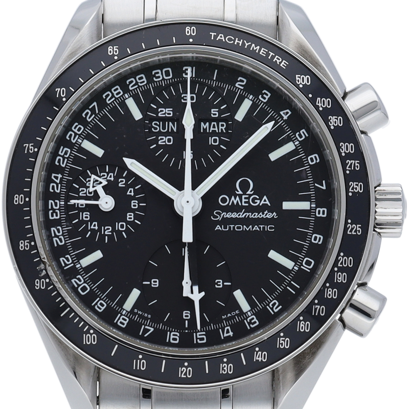 オメガの人気「スピードマスター」。クロノグラフ、月・日・曜日表示機能がついた便利な多機能ウォッチ。スタイルを選ばずにご使用いただける便利な1本。