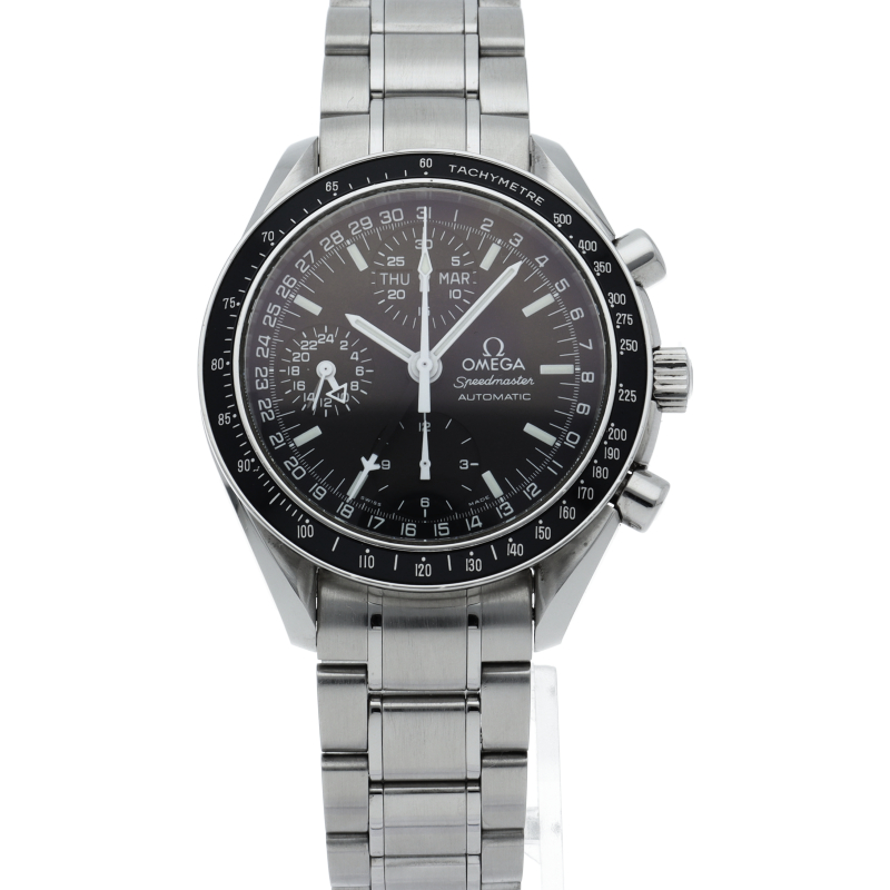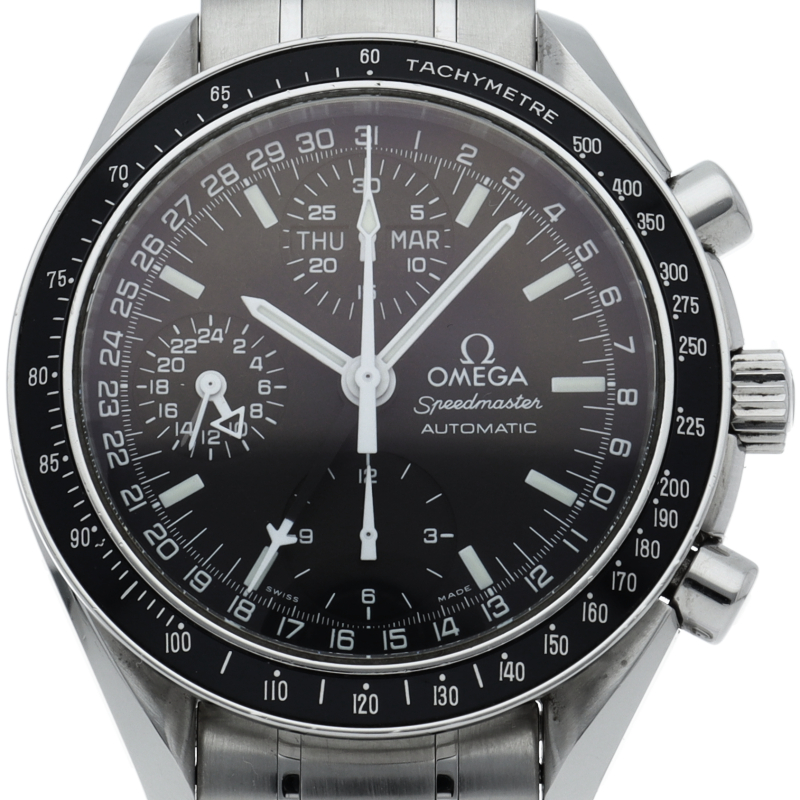 オメガの人気「スピードマスター」。クロノグラフ、月・日・曜日表示機能がついた便利な多機能ウォッチ。スタイルを選ばずにご使用いただける便利な1本。
