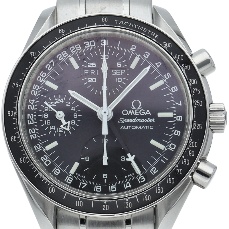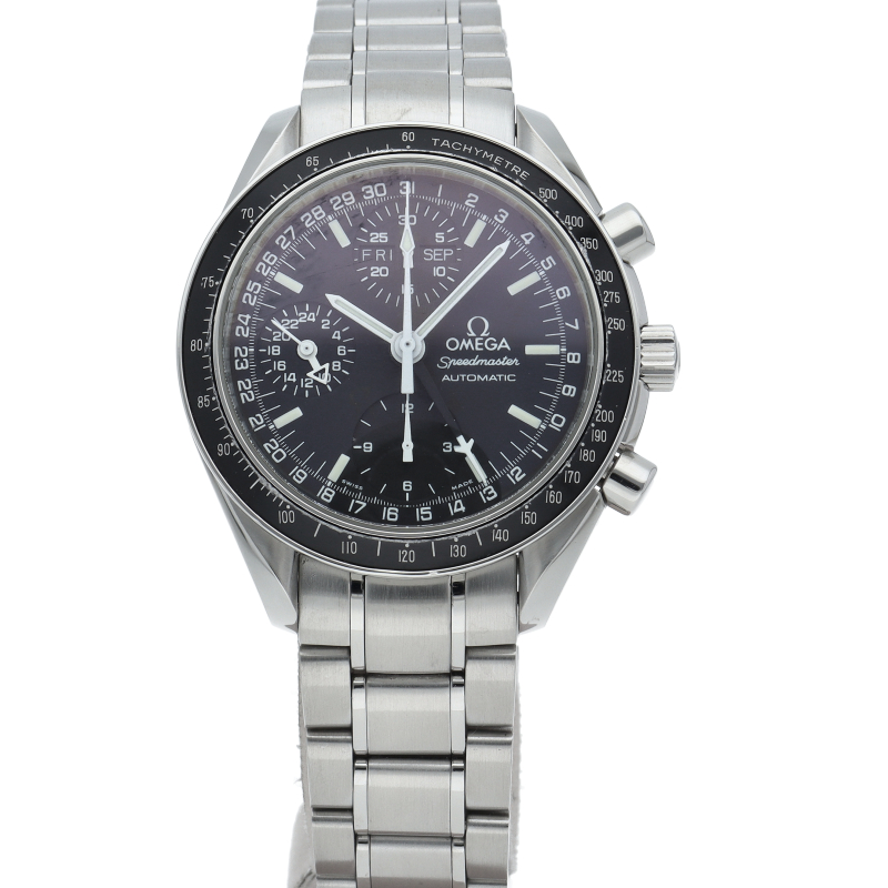 オメガの人気「スピードマスター」。クロノグラフ、月・日・曜日表示機能がついた便利な多機能ウォッチ。スタイルを選ばずにご使用いただける便利な1本。